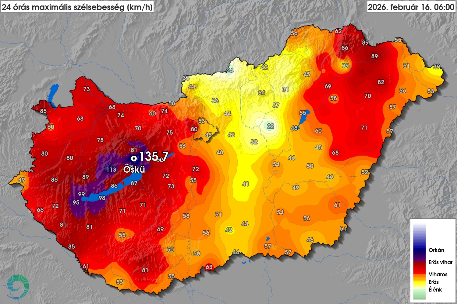 A Bakony keleti lábánál, Ösküben óránkénti 135,7 kilométeres széllökést mértek vasárnap – derül ki a HungaroMet Zrt. hétfői Facebook-bejegyzéséből. Vasárnap hidegfront haladt át az ország felett, ami sokfelé viharos, erősen viharos, a Bakonyban és a Balaton térségében orkán erejű széllel zúdította a Kárpát-medencére a hideg, sarkvidéki levegőt. A kevésbé szeles helyeken felhős maradt az ég, így ezeken a területeken magasabb volt a minimum- és a maximum-hőmérséklet is, viszont így is mindenütt fagypont alá hűlt a levegő.