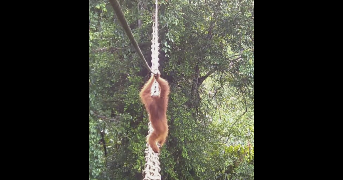 Egy fiatal hím orangután átmászott egy magas fák koronái között kifeszített, két kötélből álló hídon.