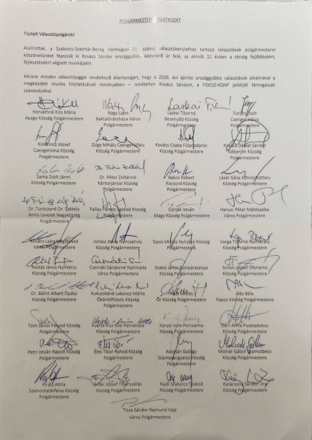 41 polgármester aláírása szerepel azon a „Polgármesteri Nyilatkozaton”, amelyet Szabolcs-Szatmár-Bereg megye 05-ös választókerületének polgáraihoz juttatak el, melyben azt kérik, szavazzanak a fideszes jelöltre.