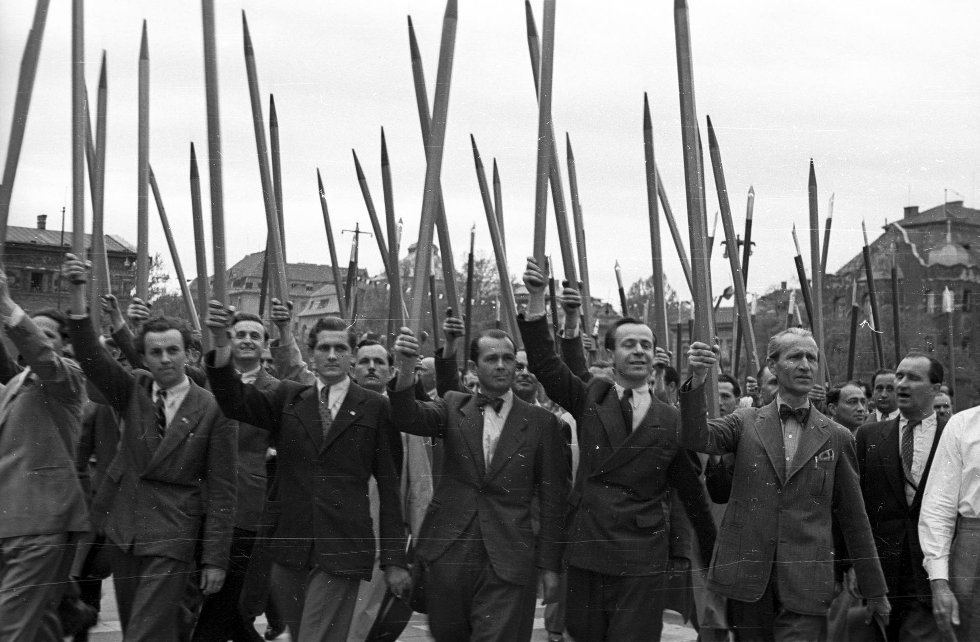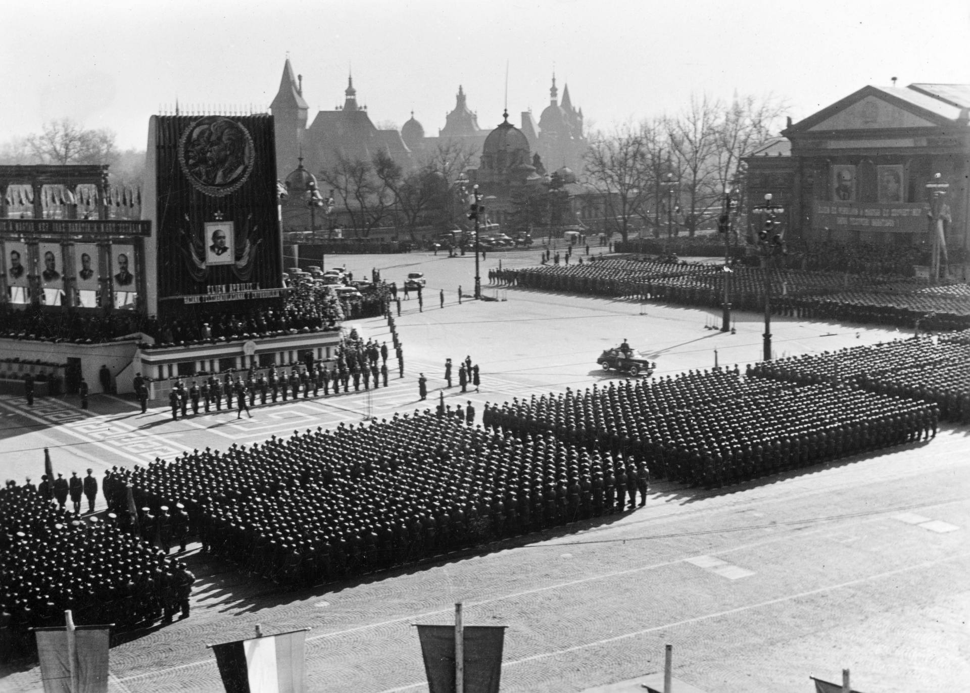 Magyarország gyorsított ütemű szovjetizálása a pártirányítás alá vett erőszakszervezetektől, a „reakciósók” és a belső ellenség kijelölésén át a koncepciós perekig, a frazeológiától az iparpolitiáig, padlássöprésig és a „kulákok” (ez maga is egy orosz szó átvétele) elleni retorziókig, az erőszakos kollektivizálásig a sztálini forgatókönyv szerint zajlott, ahogy a tömeges internálások és a személyi kultusz lemásolása alapján is igazán rászolgált Rákosi a „Sztálin legjobb tanítványa” bókokra. Ezt a szolgalelkűséget kiválóan tetten lehet érni az április 4-i katonai díszszemléken, ahol a Hősök tere monumentális szobrai előtt dübörgő szovjet mintájú tankok és az alakzatba rendezett, vezényszóra éljenző tömeg mutatta fel a rendszer erejét.