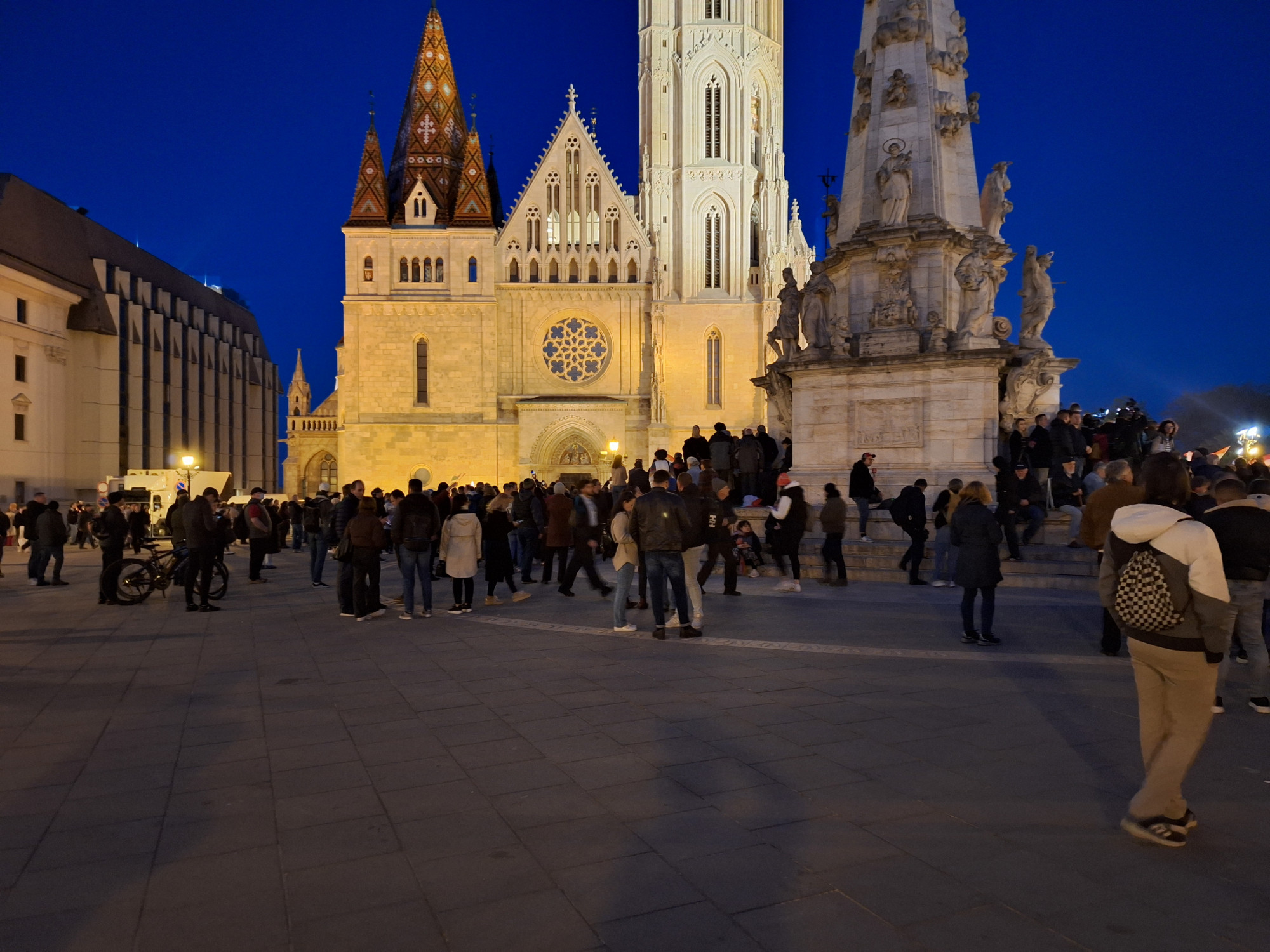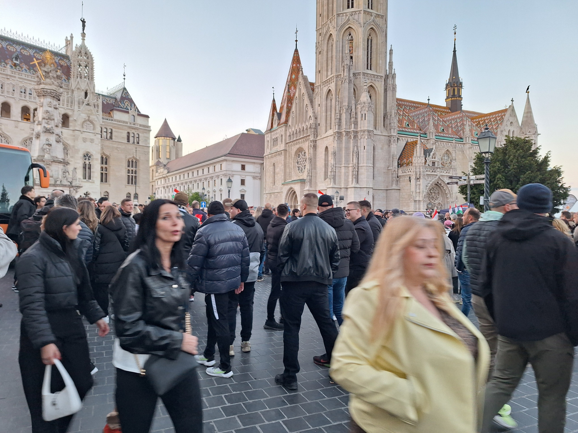 A leszálló politikusokat nem lehetett megközelíteni, a biztonságiak bő két méterre zárták járdát. A csapat a Hiltonba ment be, Orbán előtte a teraszról integett a Halászbástya felé. Kedves fogadtatásban részesült, tüntetők nem várták, volt, aki angolul biztatta. Egy biciklis férfi bömböltette csak fél hét előtt a Csurran-cseppen című számot a tér egyik sarkánál, de pont eltekert, mikor jött a busz. Azt mondta, lehet, visszajön, de később nem láttuk.