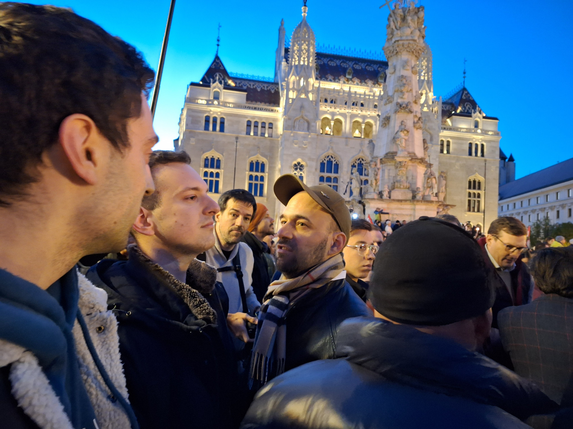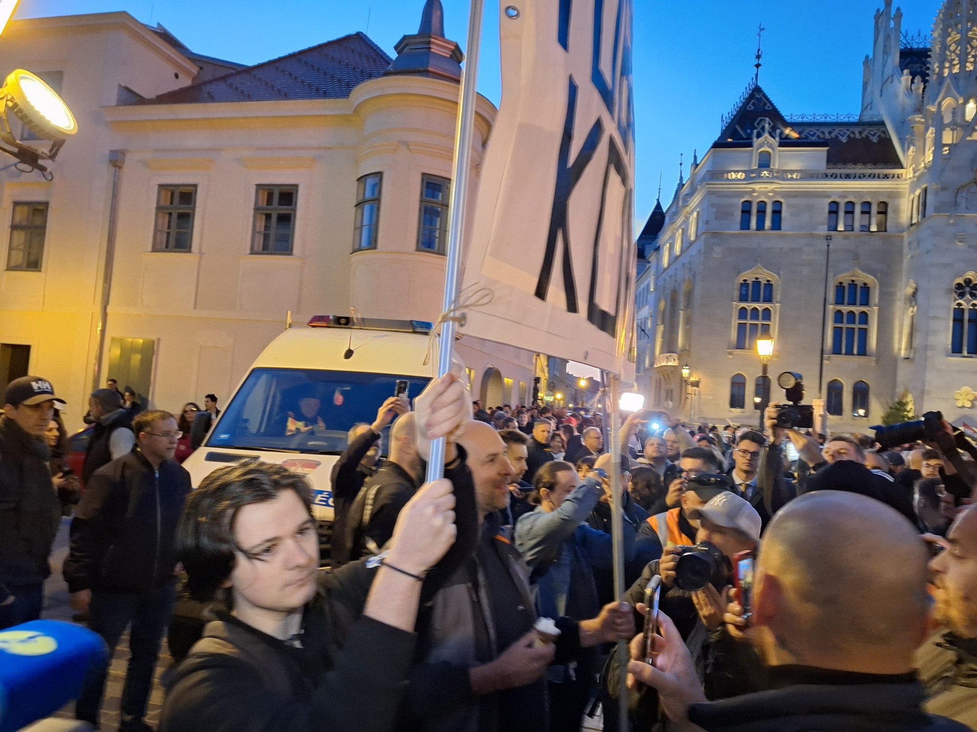 Majd Adolfék is bevetették magukat, és kiszorították a sípolókat a tömegből. Az akcióra rögtön ott termett egy „hajráfideszt” skandáló csapat, együtt nyomták ki őket.