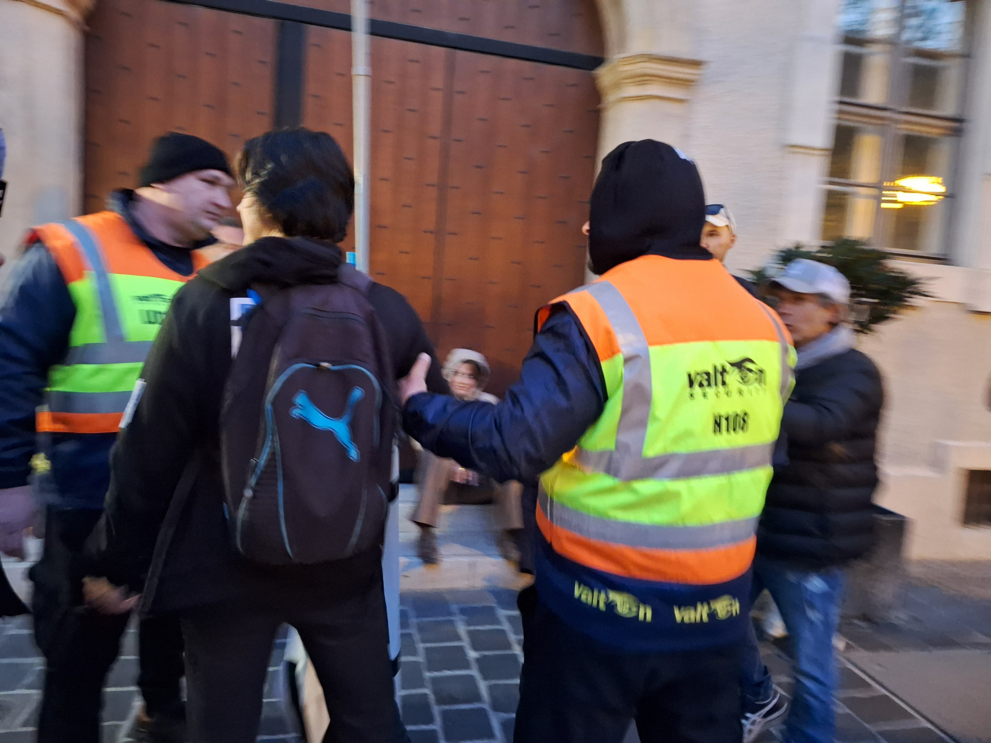 A fiú elmondta, először a busz elejénél feszítették ki a molinót, mire 4-5 fekete kabátos ember megfogta, majd megérkeztek a valtonosok és kivezették őket. Azt mondta, ketten le is köpték. Magánemberként ment ki demonstrálni, hogy megüzenje Orbánnak, vége van.