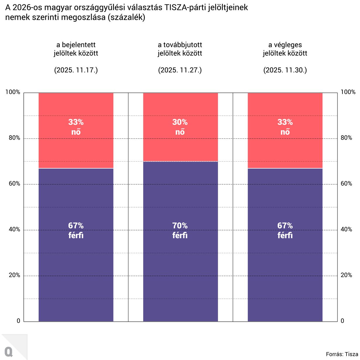 A változás egyik kulcsa az, hogy a Tisza a korábbi gyakorlattól eltérően nagy számban indított női jelölteket, ráadásul olyan körzetekben és listás helyeken is, ahol reális esélyük volt a mandátumszerzésre. Az egyéni választókerületekben a jelöltek körülbelül harmada nő volt, és hasonló arány jellemezte a párt előválasztásának első fordulóját is. A második fordulóba jutó és ott nyerő jelöltek között is megmaradt ez az arány.
