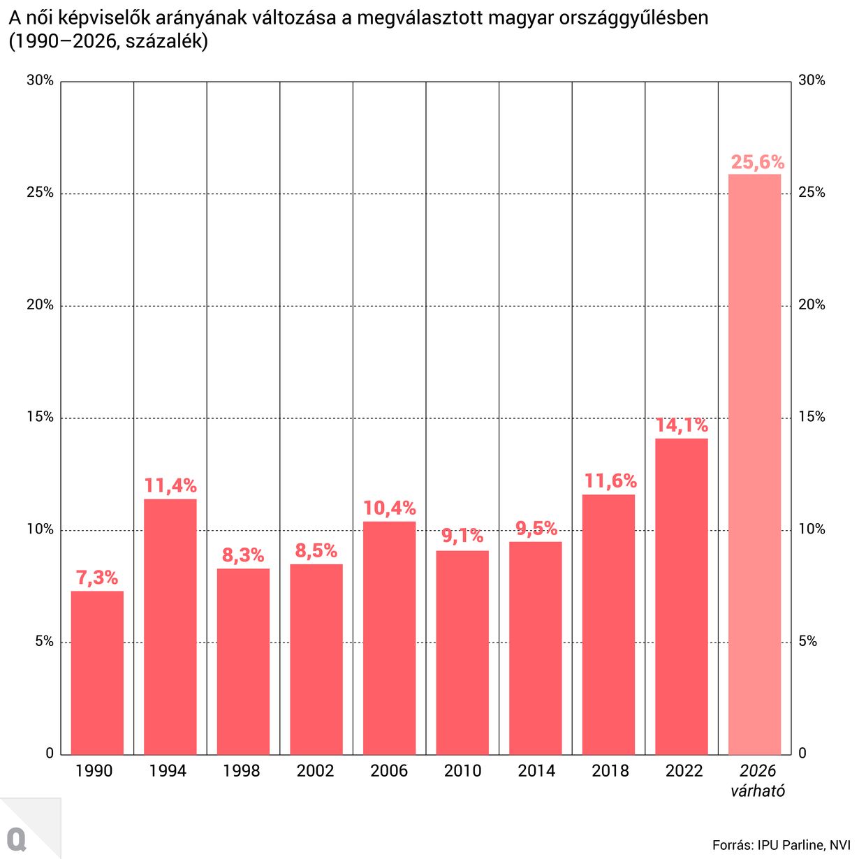 A 2026-os parlamenti választás eredményei éppen ebbe az irányba mutatnak. Magyarországon a rendszerváltás óta eltelt több mint három évtizedben a nők aránya az Országgyűlésben jellemzően 10 százalék körül stagnált, és még 2022-ben is csak 28 nő jutott be a parlamentbe, ami 14,1 százalékos arányt jelentett.