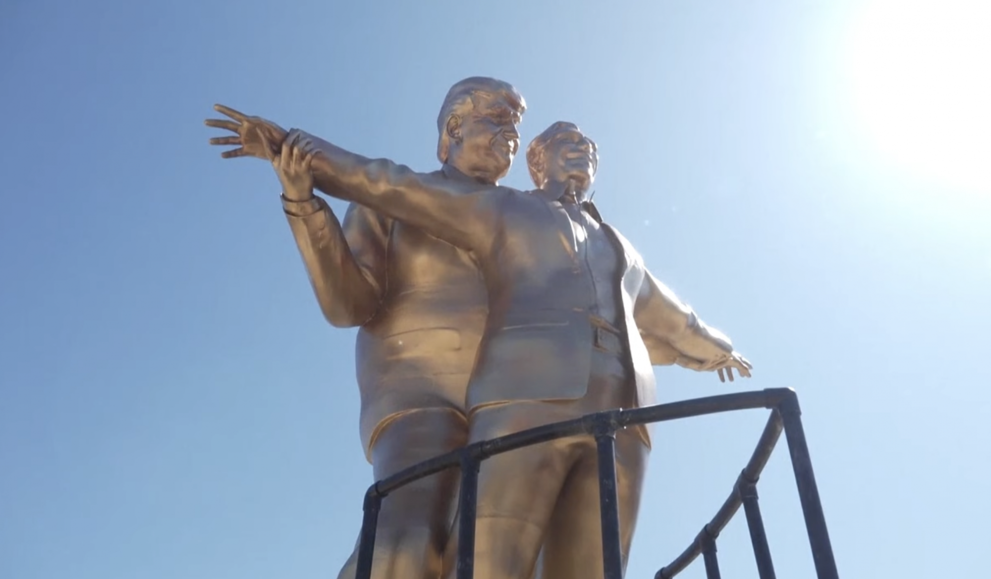 Újra lecsapott a Titkos kézfogás (Secret Handshake) nevű anonim művészcsoport Washingtonban, ahol korábban két olyan ironikus szobrot is felállítottak, amelyek Donald Trump elnök és a tisztázatlan körülmények között meghalt Jeffrey Epstein szexbűnöző barátságán élcelődnek. Az új művük egy aranyozott szoborcsoport, ami Rose és Jack Titanic orrán előadott nagyjelenetét játssza újra, a két színész helyett Trumppal és Epsteinnel a főszerepben – írja a Washington Post. A szobor talpazatára táblát illesztettek a következő szöveggel: