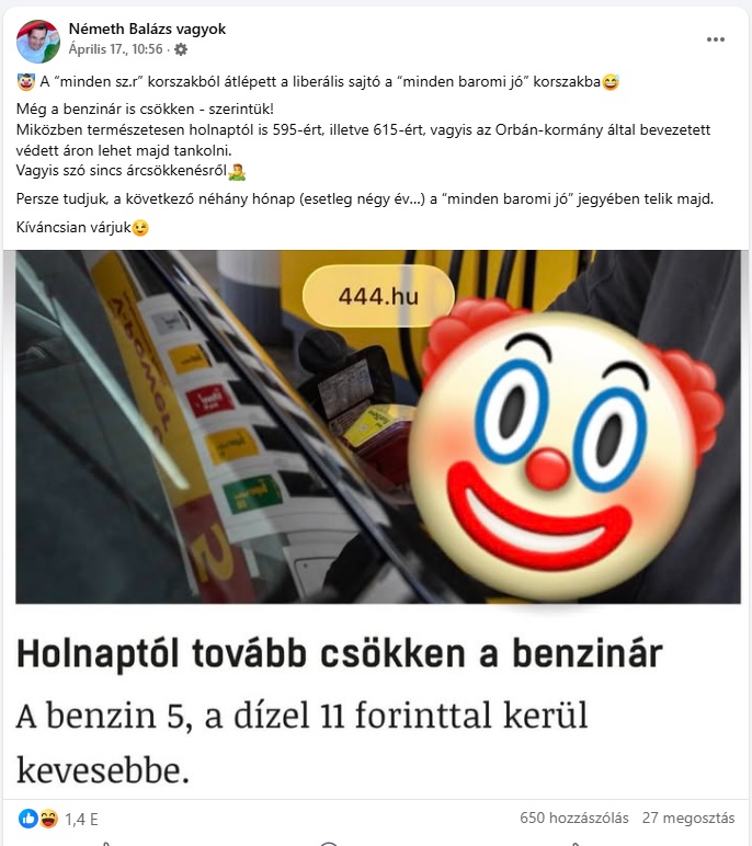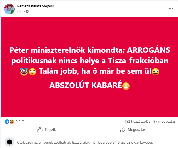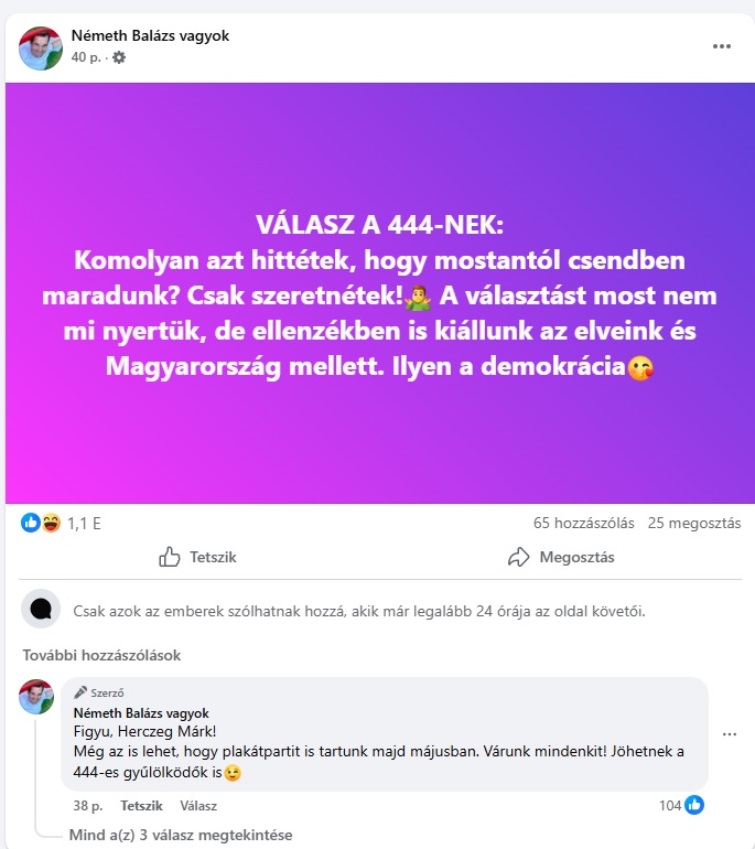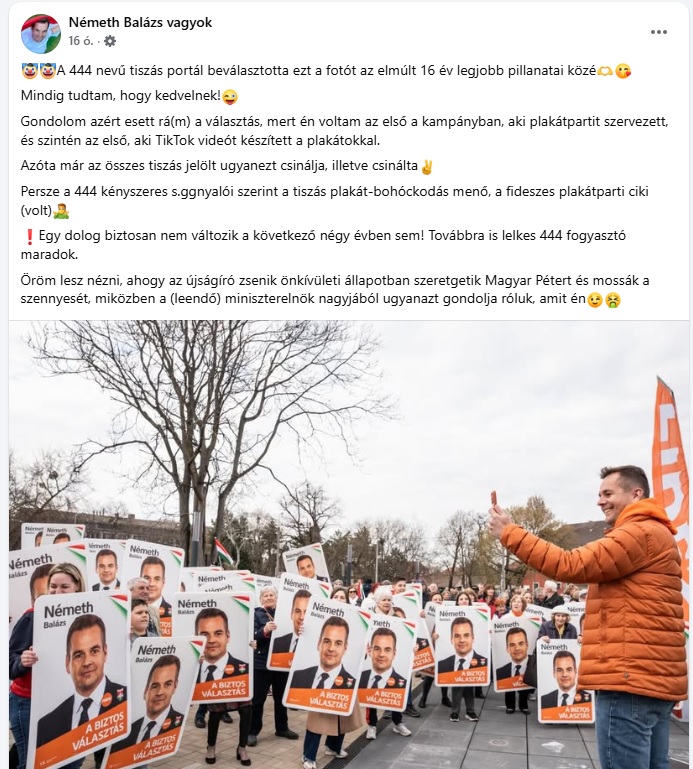 Bár Németh Balázs másnap már a saját műsorába se ment be, azóta megrázta magát. Az északkelet-pesti Kamaszuka, az utolsó töltényig harcoló bozótharcos bármiféle önreflexió nélkül pontosan ugyanúgy arcoskodik, mint a választás előtt. Többek között ilyen, szokás szerint hazug és bohócemojikkal felsőbbrendűsködő posztokkal: