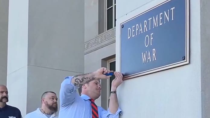 Pete Hegseth bejelentette a „Déli Lándzsa” hadműveletet a „narkoterroristák” elfojtására, miután saját kezűleg felcsavarozta a Háborús Minisztérium táblát a védelmi helyére.