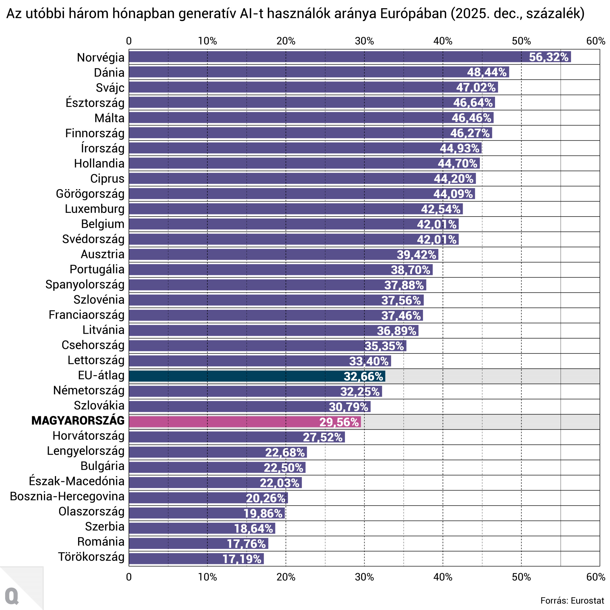 Majdnem minden harmadik ember használt generatív AI-eszközöket (ilyen például a ChatGPT, a Gemini, vagy a Midjourney kép-, szöveg- és videógenerátor) az EU-ban és néhány EFTA-országban, illetve tagjelölt országban az utóbbi három hónapban – derül ki az Eurostat múlt héten közzétett felméréséből. A 16 és 75 év közötti európaiak 25 százaléka magáncélokra, 15 százaléka szakmai, 9 százaléka formális oktatási célokra használta az AI-eszközöket. A legtöbben Dániában, Észtországban, Finnországban és Máltán hívták segítségül a mesterséges intelligenciát. Bár Norvégia nem az EU tagja, az itt végzett felmérések szerint az országban az AI-eszközöket használók aránya közel hatvan százalék volt, ami a legmagasabb arány a vizsgált országok között.