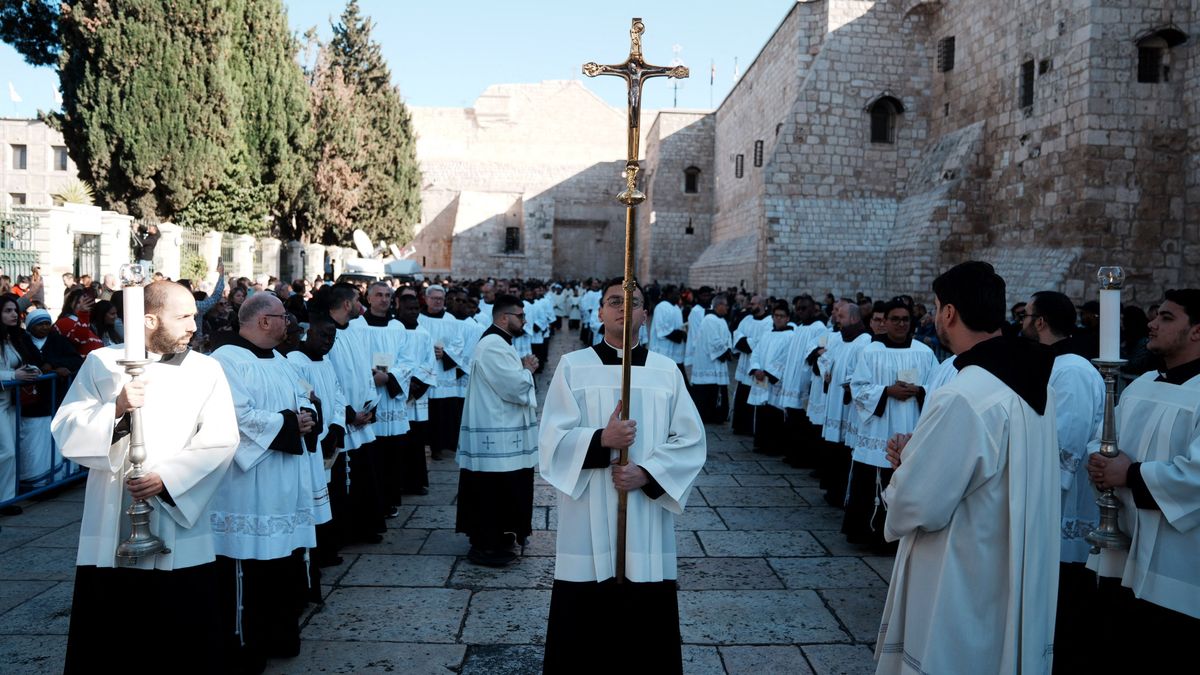 A hagyományok szerint Jeruzsálemből Betlehembe ért kíséretével Pierbattista Pizzaballa bíboros, latin pátriárka, hogy ott megtartsa a Születés templománál a katolikus Szent Katalin-templomban az éjféli misét.