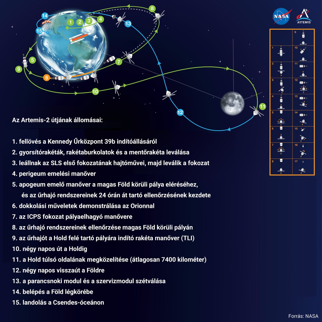 A NASA által tesztrepülésnek nevezett Artemis–2 előkészíti az újbóli amerikai holdraszállást, amire az űrhivatalt vezető Jared Isaacman februári célkitűzése szerint két év múlva, 2028-ban kerülhet sor az Artemis–4 küldetésen. A tét óriási: ha az Artemis–2-n minden simán megy, az lökést adhat az amerikai holdprogramnak, és valószínűbbé teheti, hogy az Egyesült Államok lekörözi Kínát a 21. századi holdversenyben és az első állandó holdbázis létrehozásában. Ehhez ugyanakkor a csütörtökön indult küldetés sikerén túl az is kell, hogy Elon Musk SpaceX vagy Jeff Bezos Blue Origin vállalata elkészüljön az űrhajósokat a Hold felszínére juttató holdkomppal, és az Axiom Space legyártsa az asztronauták űrruháit.