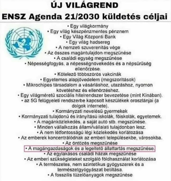 Erre rímel az a közösségi médiában újra és újra, az aktuálisan népszerű összeesküvés-elméletekhez igazított formában feltűnő kép is, amelynek – ahogy azt a járvány idején megjelent cikkünkben is kifejtettük – már a címe is két különböző ENSZ-dokumentum összeollózása: az Agenda 21 egy 1992-ben készült cselekvési terv volt, amely főként környezetvédelmi és társadalmi egyenlőségi kérdésekkel foglalkozott, míg a 2030-ra szóló fenntarthatósági fejlődési célokat 2015-ben fogadták el. Igazságtartalmát is ehhez mérten kell értékelni – az 5G-s és mikrochipes konteókon túl minden világkormány-toposz megjelenik benne, és természetesen forrás nélkül terjed, elsősorban szélsőjobboldali körökben.