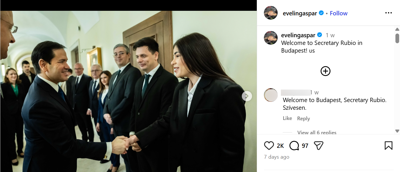 Miután Lázár János vécépucolós kijelentésével magára haragította a cigányságot, Orbán Viktor Gáspár Evelinnel és Szijjártóval posztolt közös videót. Gáspár Evelin februárban Marco Rubio amerikai külügyminiszterrel is kezet fogott, akkor posztolta Instagramra a közös képet a legendássá vált „Welcome to Secretary Rubio in Budapest!” leírással.