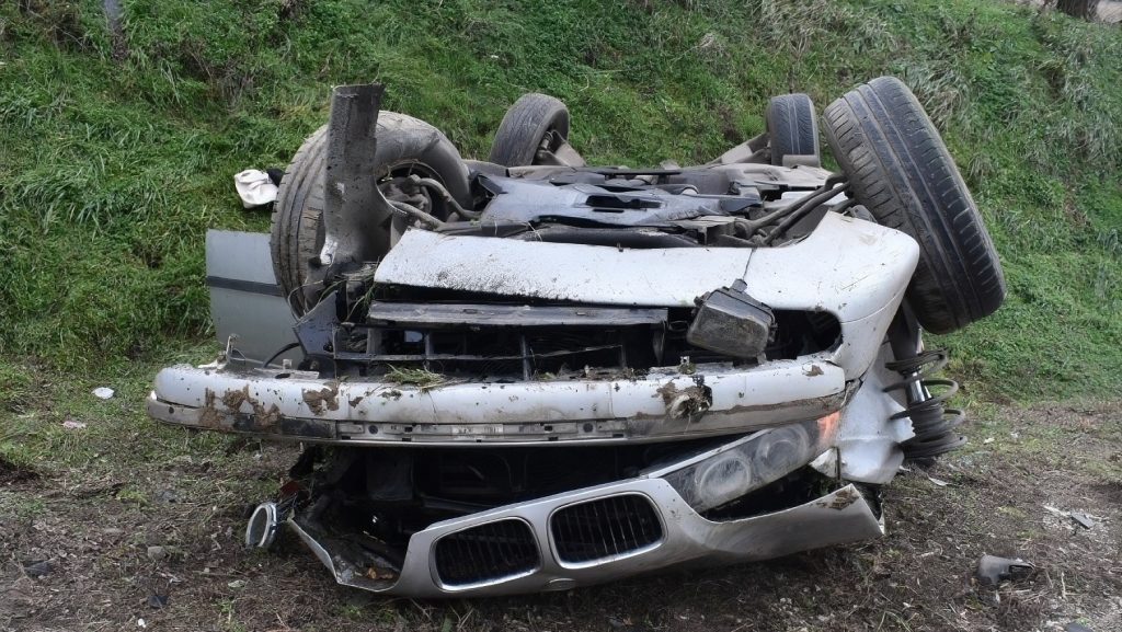 A terhelt nem tudta az autót az úttesten tartani, ami először egy terelőoszlopnak, majd az út melletti magas partnak csapódott, végül a tengelye körül többször átfordulva a tetején állt meg.