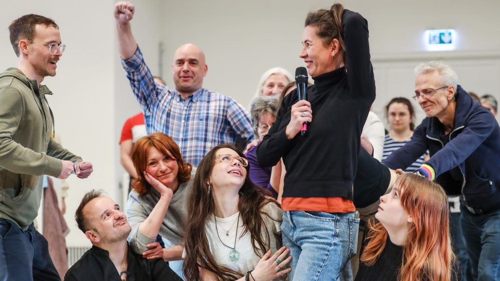 Jó, az Örkényben már nem kifejezetten meglepetés, hogy a színpadon civilekkel is találkozik az ember, készítettek már például darabot az alkoholizmusról, érintettek bevonásával 1,5 ezrelék címmel (erről itt írtunk bővebben), vagy a szociális szférában dolgozókkal együttműködve (ez volt a Kiváló dolgozók); és aki elolvassa a színlapot, azt ezúttal sem fogja váratlanul érni, hogy a második etapban eltűnnek a színészek, s helyettük több tucat vidáman táncoló civil várja a szünetről visszaérkező közönséget.