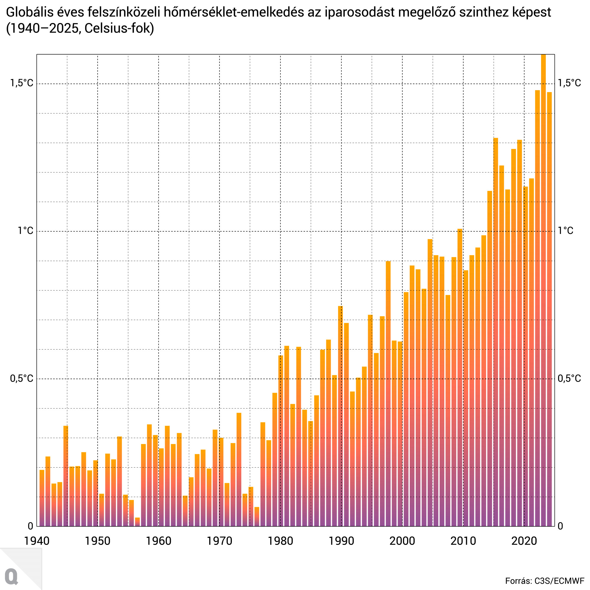 A klímaváltozás-figyelő szervezet szerint 2023-2025 volt az első hároméves időszak az emberi civilizáció történetében, amikor három év átlagát nézve a Földön több mint 1,5 fokkal volt melegebb az iparosodást megelőző periódusnál (az 1850 és 1900 közötti időszak globális hőmérsékleti átlaga). Mára a hosszú távú globális felmelegedés mértéke elérte az 1,4 fokot, és ha a felmelegedés a mostani ütemben folytatódik tovább, a párizsi megállapodás 1,5 fokos klímacélját az évtized végéig átléphetjük.