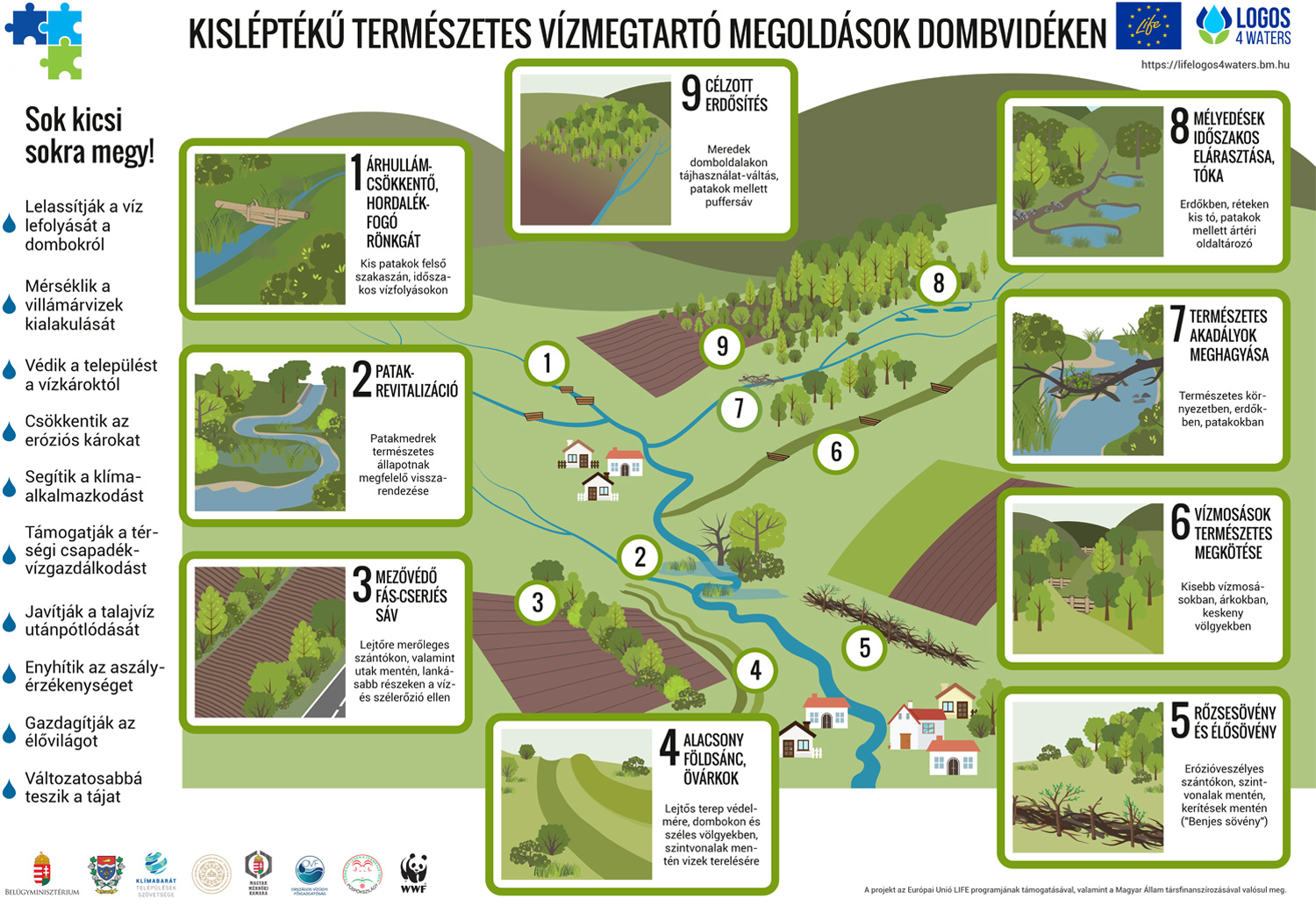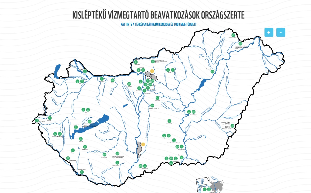 Az interaktív térképen megtalálhatók a több tucat önkormányzat bevonásával zajló LIFE LOGOS 4 WATERS projekt síkvidéki és dombvidéki mintaterületein alkalmazott, a Vízválasztó Mozgalom koncepciójában is felsorolt természetes vízmegtartó megoldások – esőkertek, vízáteresztő burkolatok, zöldtetők, rönkgátak.
