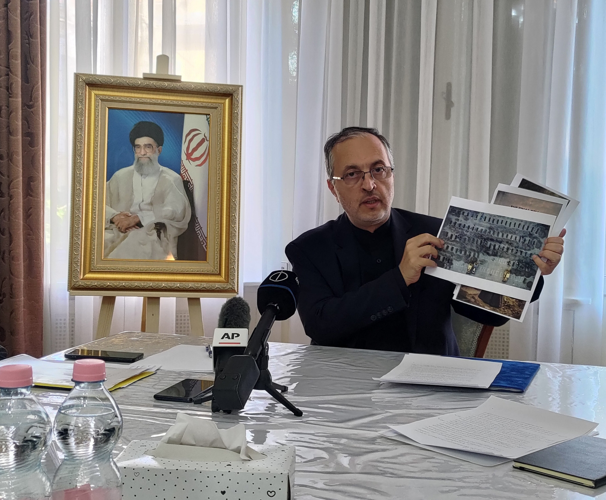 Morteza Moradian nagykövet egy díszes tárgyalóasztalnál, az amerikaiak által megölt Ali Hamenei ajatollah fényképe előtt fogadta a megjelent újságírókat. Mivel éppen Ramadán van, az asztalra csak ásványvizet raktak ki, ételt nem. A nagykövet fárszi nyelven beszélt, magyar tolmácsolással. Elsőként elmondta, hogy a szomszédos szobában Hamenei ajatollahra emlékeznek, ezért előfordulhat, hogy más országok nagykövetei érkezhetnek, hogy leróják tiszteletüket.