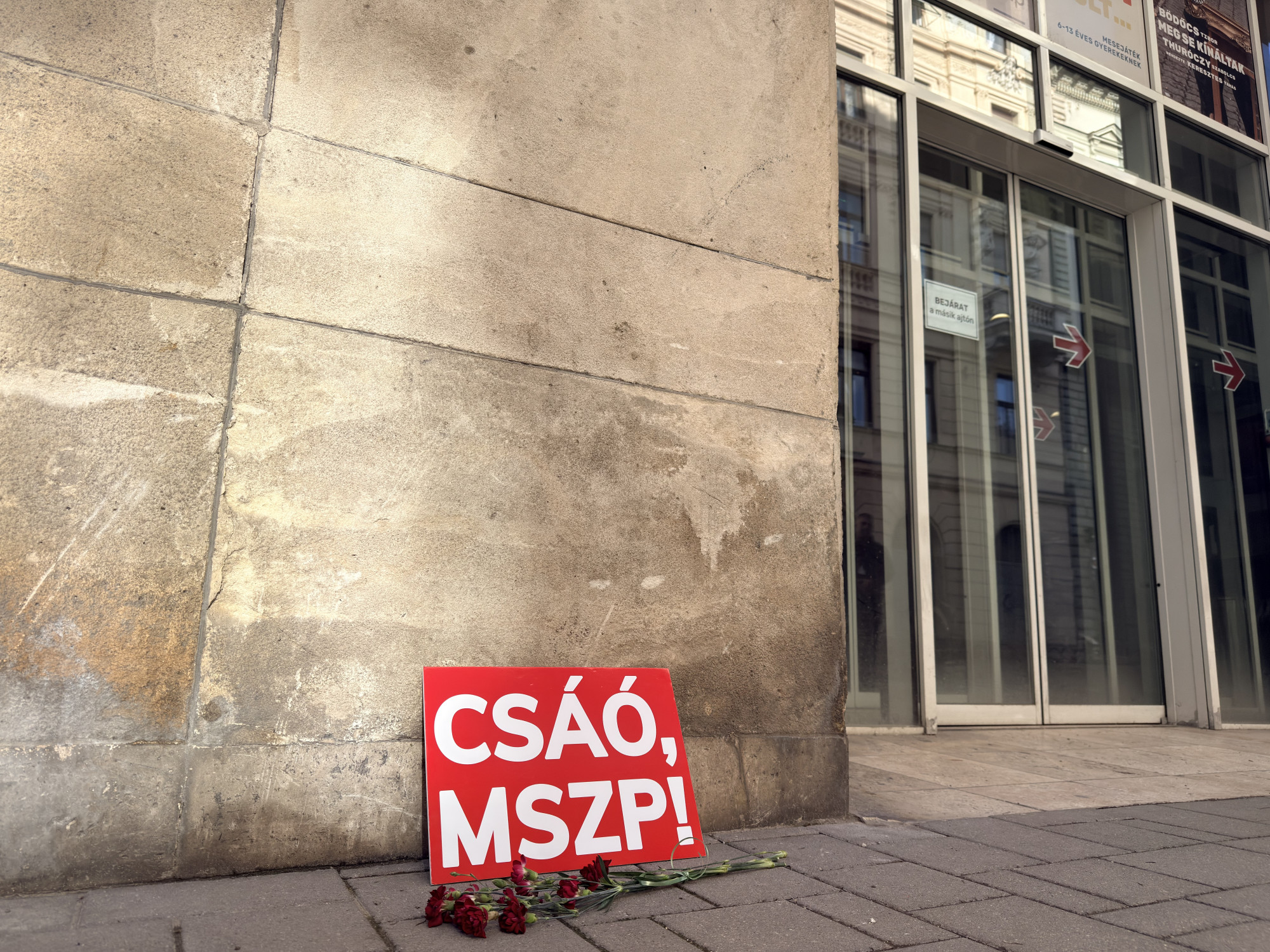 „Csáó MSZP” feliratú tábla és tíz szál hanyagul összekötött szegfű – így köszöntek el ismeretlenek a szocialistáktól, miután február 20-án hivatalossá vált: a párt nem indul a 2026-os országgyűlési választáson.