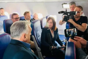 Az ATV-től a közmédiához igazolt Csuhaj Ildikó is ott ül Orbánnal a Wizz Air-gépen, sőt, keményet kérdezett tőle