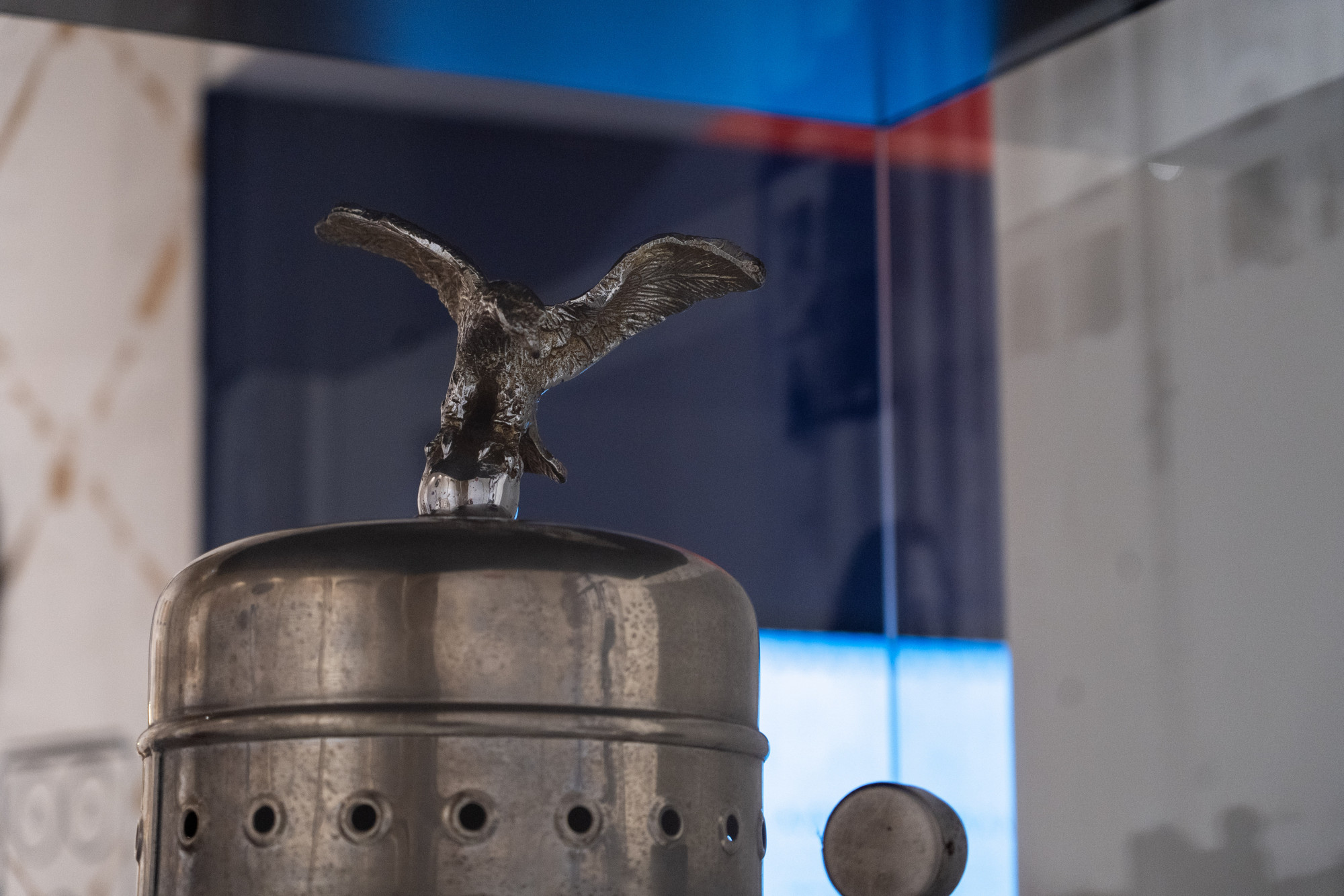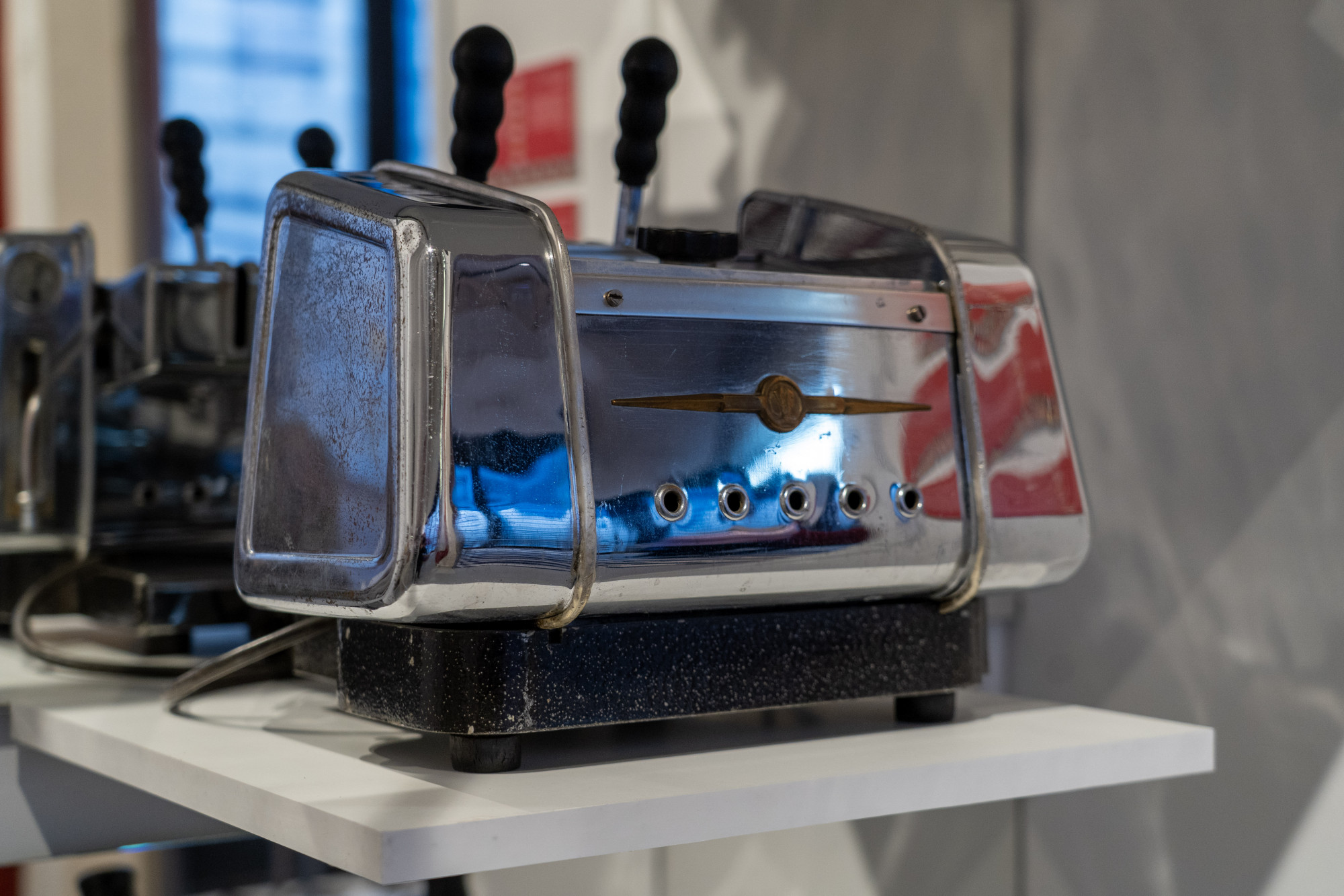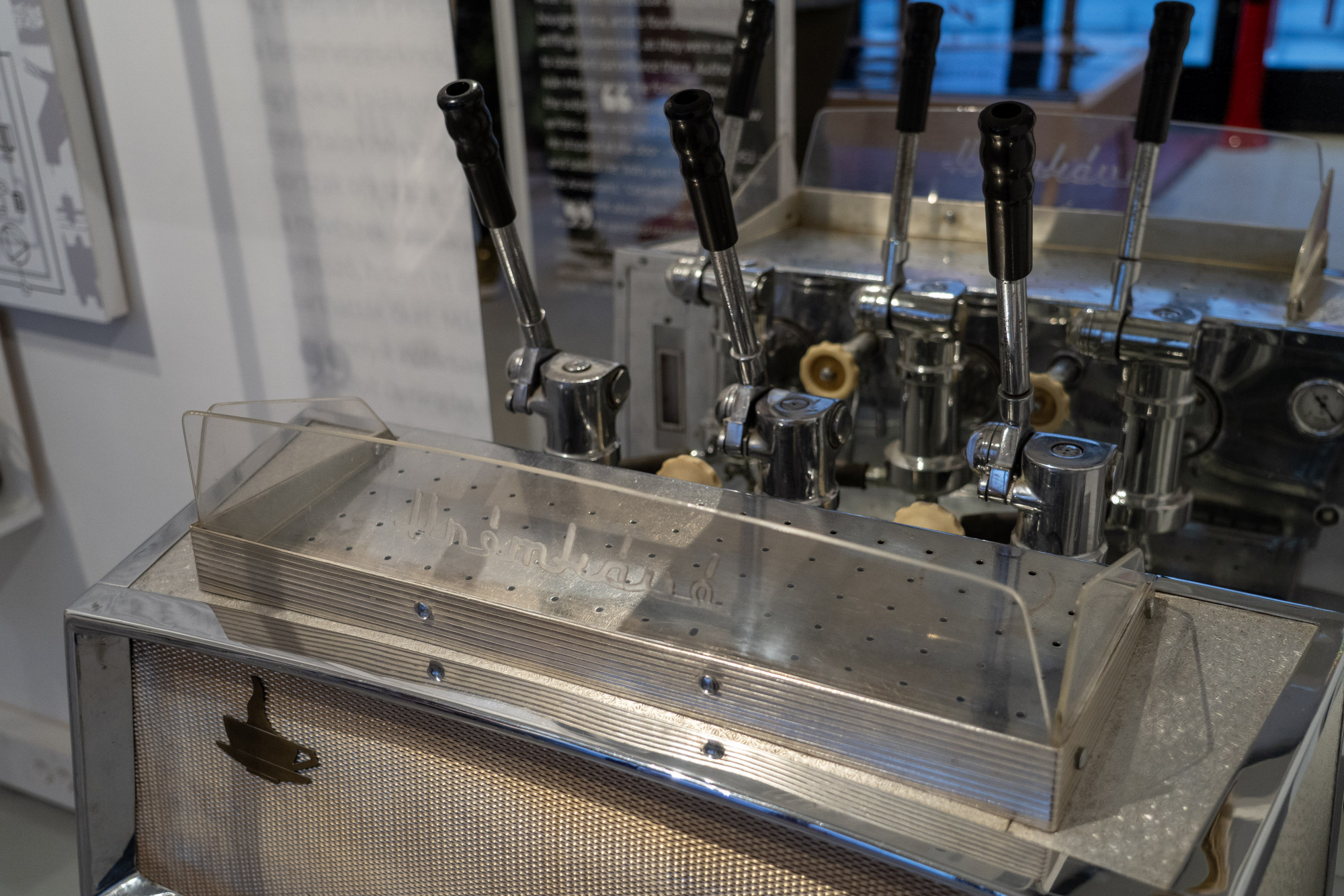 Vannak még hamutálak, kanalak és kávészsákok is, a háttérzaj pedig egy nyugodalmas kávéházat idéz: gurulnak a babok, csilingelnek a kanalak, és mivel a kasszánál az időszakos kiállítás idején az MTRM Roast kávéit is kóstolhatjuk, néha megszólal a kávégép is. Ez kissé furán hat, amikor az ember még csak a kávébabot rágcsáló etiópoknál tart a kronologikusan felépített kiállításban, de a kávéillat kárpótol a hangért. A későbbiekben, a bejárattól távolabb pedig már inkább az jut az ember eszébe, hogy milyen hangja lehetett az 1913-as olasz La Pavoni Omega presszógépnek, ami pont úgy néz ki, mint egy jelentősebb szent ereklyetartója, van vagy egy méter magas és tippre úgy száz kiló, sas is van rajta, de természetesen otthonra is kéne. Már csak a sas miatt is.