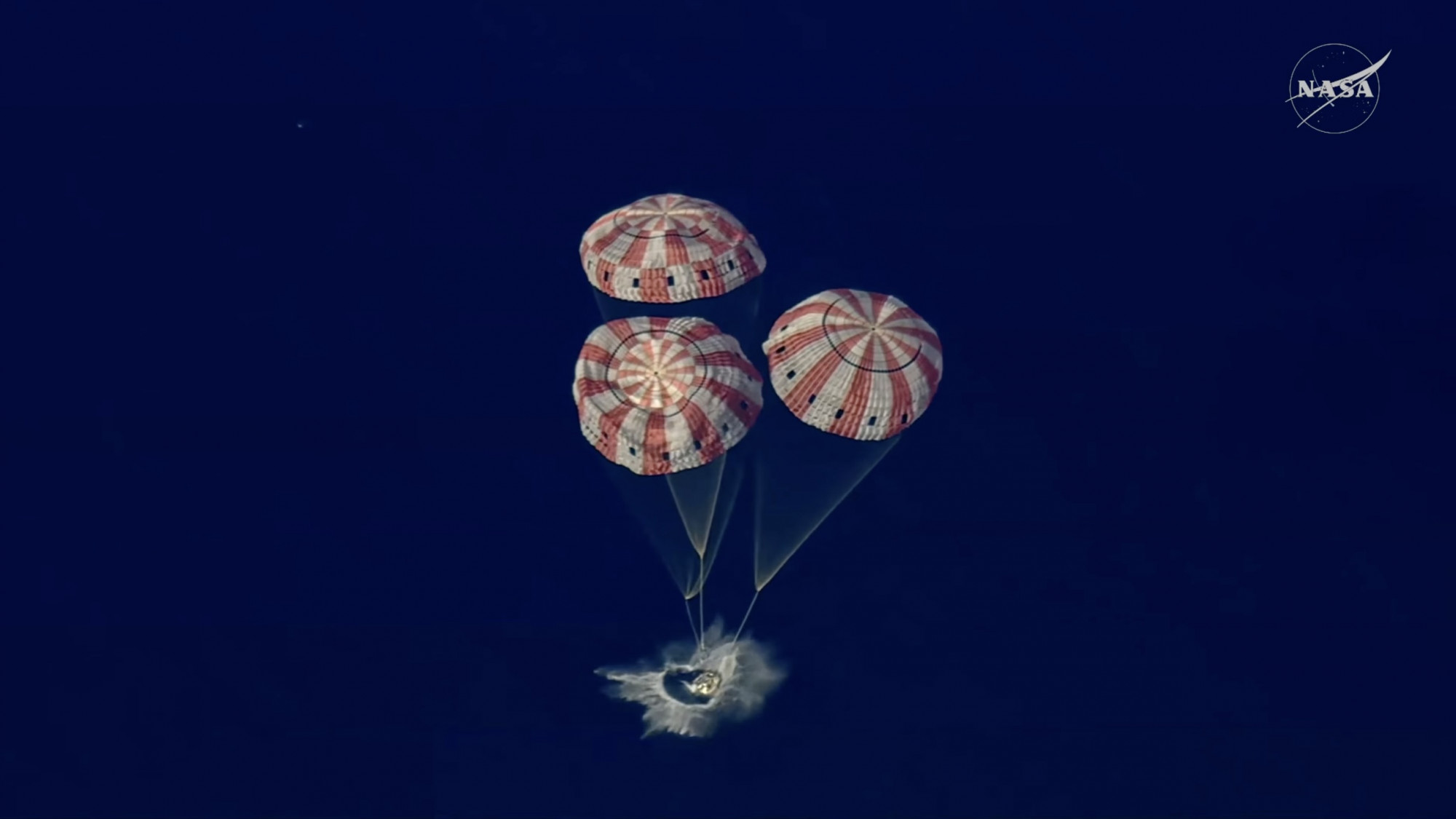 Az idegőrlő pillanatok után 6700 méteres magasságban kinyílt az Orion két fékezőernyője, majd egy perccel később a három főernyő is, ami után az űrkapszula nem sokkal a Csendes-óceánba csobbant. Az óceán felszínén lebegő kapszulát később az amerikai haditengerészet helikopterei közelítették meg, amik az űrhajósokat a USS John P. Murtha partraszállást támogató hadihajó fedélzetére szállították. A hajón, amire két órával később az űrkapszulát is bevontatták, az űrhajósok orvosi vizsgálaton estek át, mielőtt a NASA Johnson Űrközpontjába utaznak tovább.