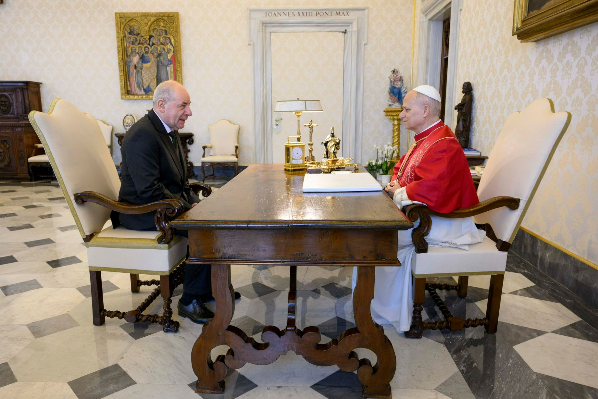 Sulyok Tamás Magyarország ajándékaként egy Madonna-szobrot adott át az egyházfőnek, amely a Magyar Nemzeti Galériában őrzött, Toporci Madonna néven ismert 15. századi alkotás herendi porcelánból készült hű mása. Ez volt a második találkozó a pápa és Sulyok Tamás között, aki XIV. Leó tavaly májusi beiktatásán is részt vett a Vatikánban.