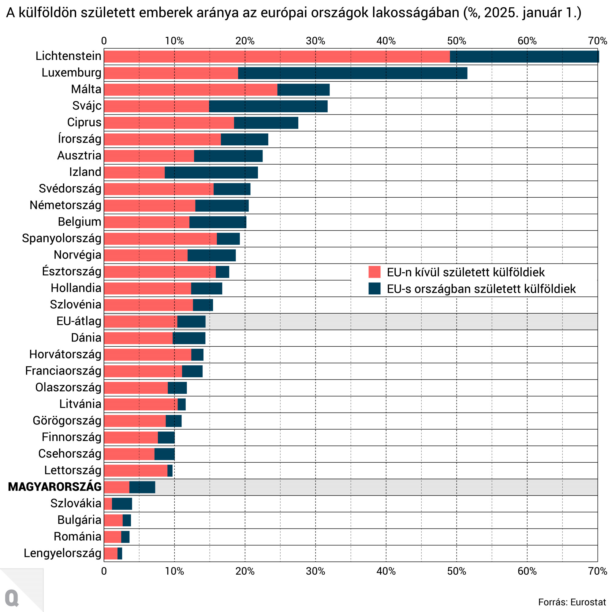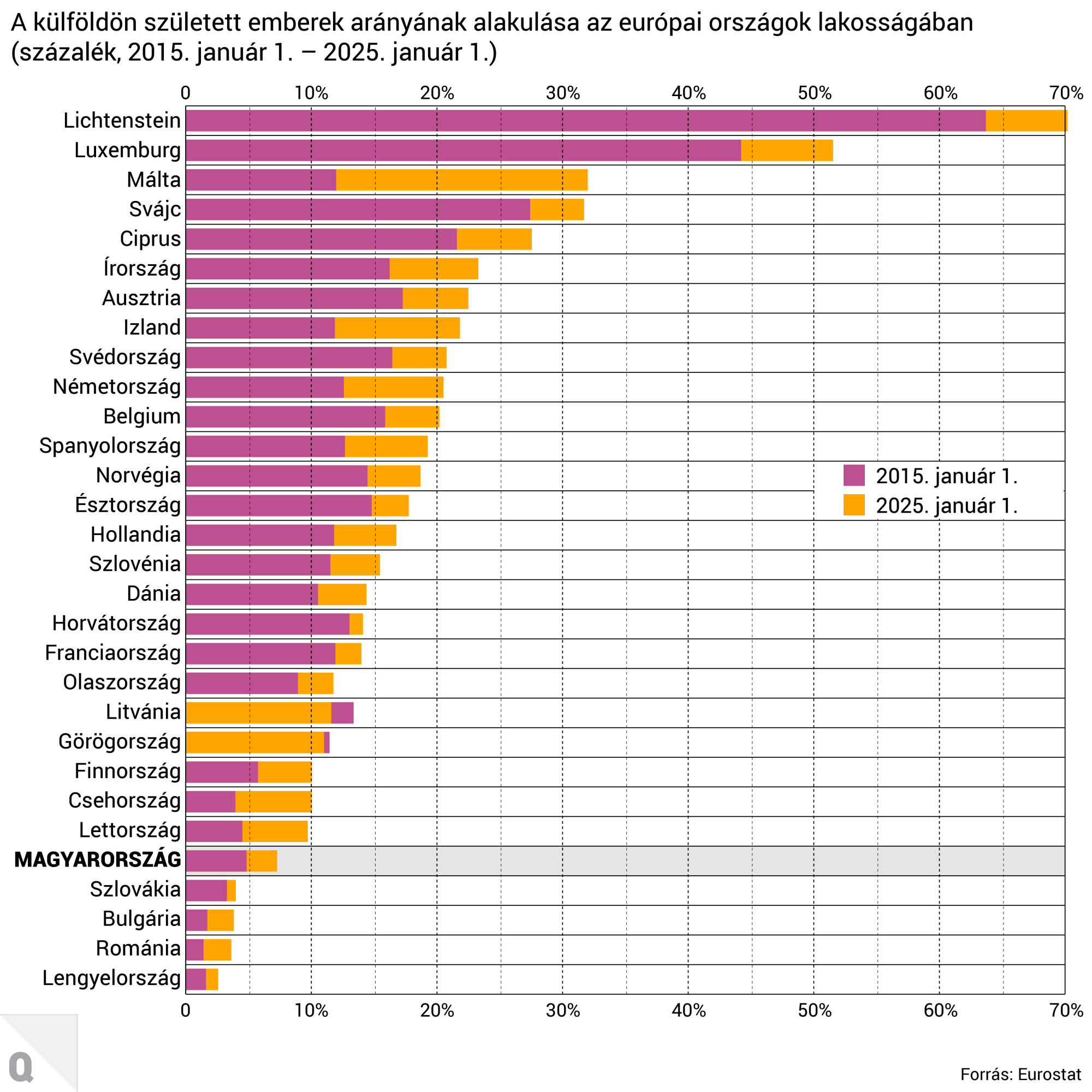 Ha a 2015. január 1. és 2025. január 1. közötti változást vizsgáljuk, azt látjuk, hogy az EU-n kívül született, de valamely uniós tagállamban élő emberek aránya Lettország és Görögország kivételével minden tagállamban emelkedett. Arányukat tekintve a legtöbb nem uniós országban született lakos Liechtensteinben, Luxemburgban, Máltán és Cipruson élt – Máltán például tíz év alatt több mint kétszeresére nőtt a számuk. A legalacsonyabb arány a kelet-közép-európai tagállamokban volt jellemző, köztük Magyarországon.