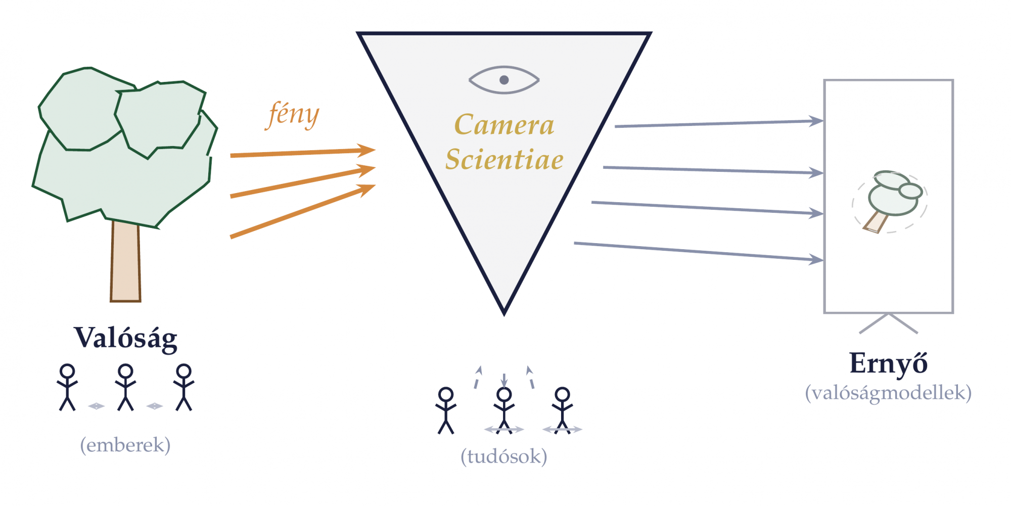 Képzeljünk el egy fát. A fa a valóság – az a tőlünk független világ, amelyet megpróbálunk megérteni. A fáról fény verődik vissza, elvileg ezt látjuk. De valójában nem a valóságot látjuk, hanem annak különféle desztillátumait, azaz modelljeit, sőt elméleteit, amelyeket számunkra egy furcsa vetítőgép alakít át. Nevezzük ezt camera scientiae-nek, a „tudás kamrájának”. A kamra maga a tudomány, a tudásháló: a fogalmi keretek, a tudósok közössége, a publikációk, a kísérleti berendezések. A kamra hátsó falán, az ernyőn pedig megjelenik a fa valamely részének a képe – leegyszerűsítve, de felismerhetően. A tudósok maguk csak az ernyőt látják, azon keresztül értik meg a valóságot.