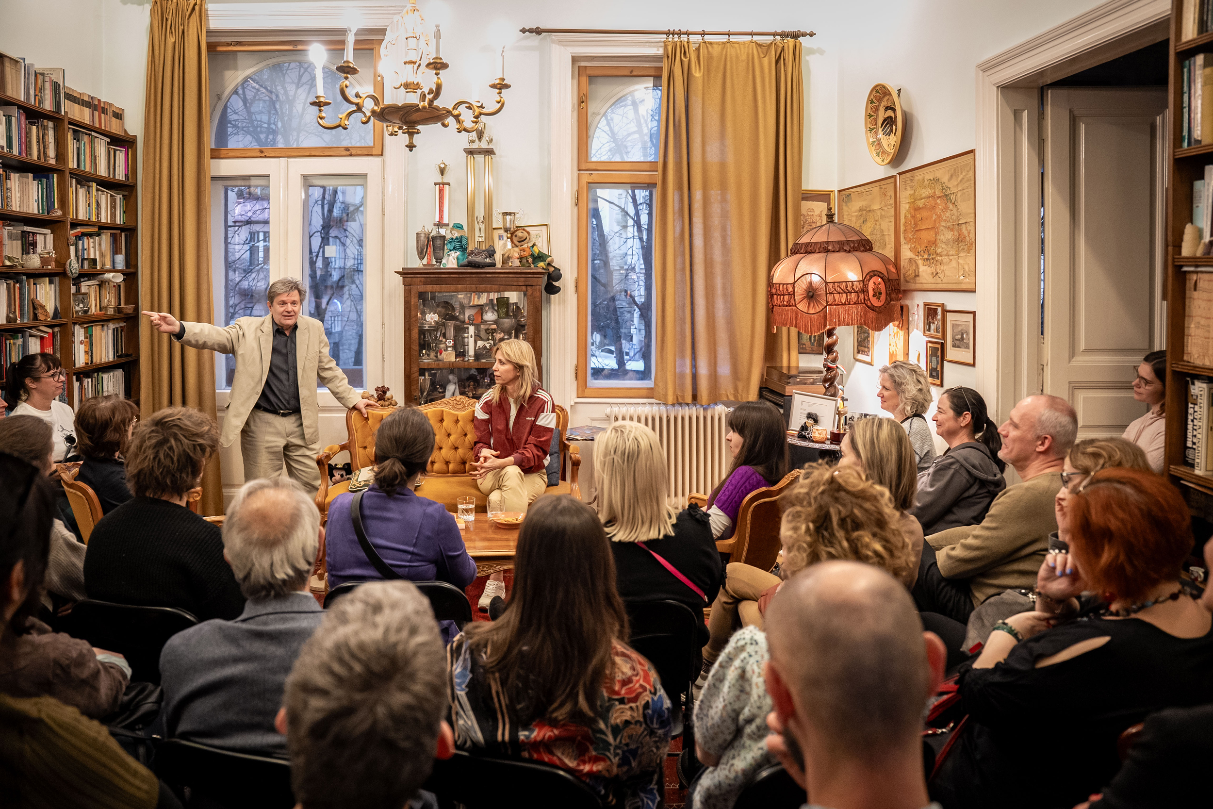 Nincs sok idő a könyvgerinceket böngészni (a Gyűrűk Ura-sorozat azért feltűnik), hamar tovább terelnek minket a tágas dolgozószóbába – itt is tengernyi könyv, de már utcafrontra nyílnak az ablakok –, pogácsával kínálnak, olyan az egész, mint egy házibuli szégyenlős első percei. Aztán feltűnik Gyabronka József (azaz Feledy Péter), és olyan természetességgel kezdi mutogatni a falon függő képeket, aztán merül hosszas sztorizgatásba a Monspart-család történetéről (eredetileg például a ház többi emelete is az övék volt, de állítólag elkártyázta egy kedves felmenő), hogy el is feledkezünk a pogácsáról.