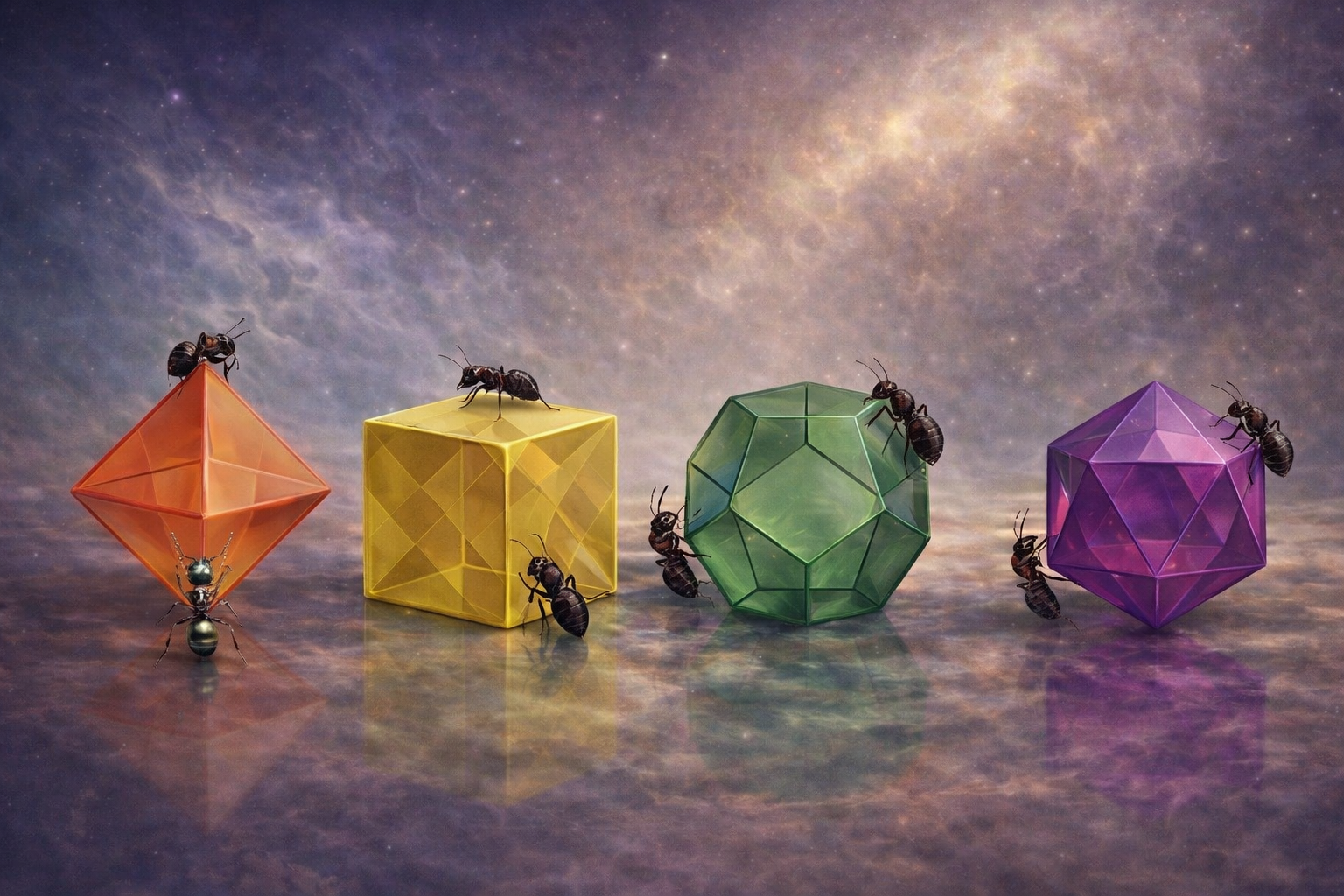 290. feladványunkban azt kérdeztük, hogy az alábbi négy szabályos test közül melyiknél a legkisebb a valószínűsége annak, hogy a szemközti csúcsokból induló hangyák legfeljebb tíz lépés után egy csúcsban találkoznak, ha minden lépésben véletlenszerűen és szimultán átlépnek egy szomszédos csúcsra. Az érdekesség az volt Boros Péter feladatában, hogy nem kellett hozzá semmit számolni, mert az egyik test esetében be lehetett látni, hogy soha nem találkozhatnak a hangyák, tehát a valószínűség nulla, míg a többi esetben a találkozás lehetséges. Most a legegyszerűbb esetet nézzük, amikor valóban találkozhatnak a hangyák, a kérdés viszont picit más lesz.