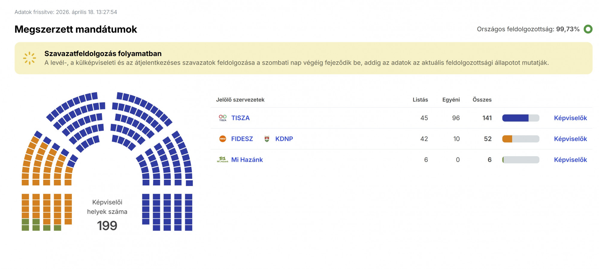 Újabb mandátum fordult át a Fidesztől a Tisza javára szombaton: a szavazatszámlálások utolsó napján még egy listás helyet szerzett a Tisza Párt, amit a Fidesztől vett el. Ezel a Tisza frakciója 141 fősre nőtt, a Fidesz-KDNP-é pedig 52-re csökkent, így még egy, eddigi kormánypárti politikusnak kell elbúcsúznia a parlamenti székétől.