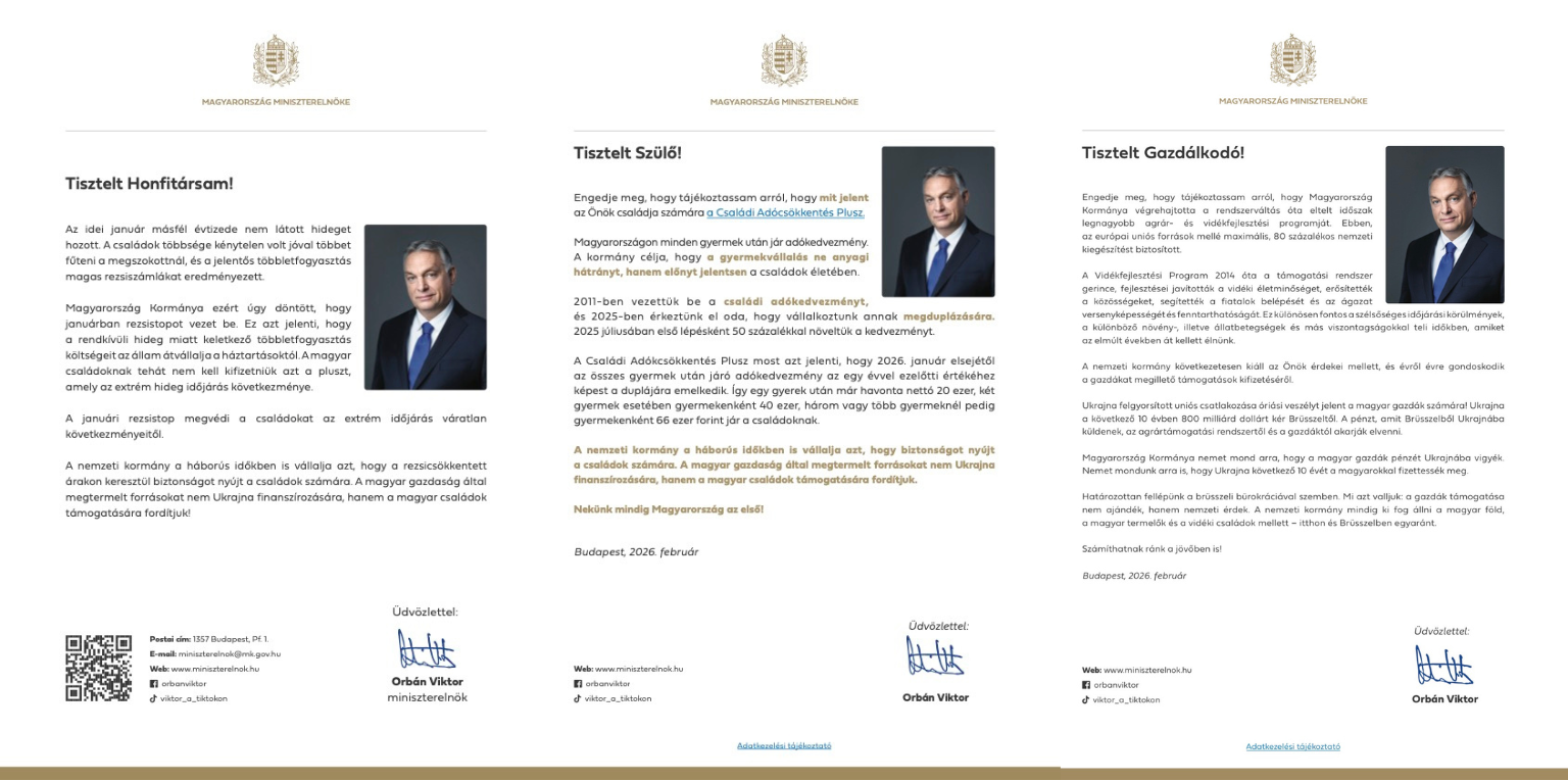 Kapott levelet minden szülő is, ezt a NAV küldte ki az ügyfélkapus tárhelyre, a megtévesztő „Tájékoztatás családi adókedvezményről” címmel. A levelet letöltve itt is a fess miniszterelnök arca köszön vissza, aki azt közli, hogy a 2011-ben bevezetett családi adókedvezmény összegét 2025-ben 50 százalékkal megemelték, ami így egy gyerek után már eléri a húszezer forintot, kettő után pedig a negyvenezret. Míg a rezsistopos levélnél legalább az időzítés magyarázható valamilyen módon, itt már ennyire sem adtak a látszatra. Ráadásul a „háborús” veszély nem csak az gáz- és áramfogyasztókat, de a szülőket is veszélyezteti. „A nemzeti kormány a háborús időkben is vállalja azt, hogy biztonságot nyújt a családok számára. A magyar gazdaság által megtermelt forrásokat nem Ukrajna finanszírozására, hanem a magyar családok támogatására fordítjuk” – zárul a kampánylevél.