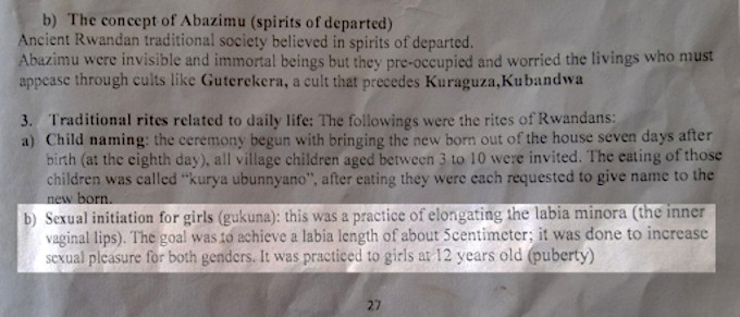 „Szexuális beavatás lányok számára (gukuna): ez egy olyan gyakorlat volt, amely a kisajkak (a hüvelybemenetet védő bőrredők) megnyújtását jelentette. A cél az volt, hogy a kisajkak hossza elérje a körülbelül 5 centimétert. Ezt azért végezték, mert úgy tartották, hogy mindkét nem számára növeli a szexuális élvezetet. A gyakorlatot 12 éves lányoknál, a pubertás idején kezdték.”