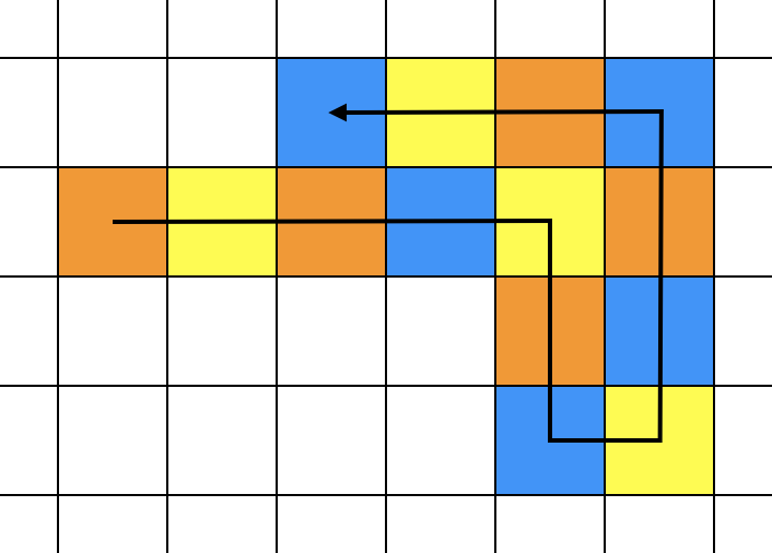 Ezen kívül amikor új mezőre érkezik, megvizsgálja az összes 2×2-es blokkot, amik ezt a mezőt tartalmazzák (ebből ugye négy darab van), és nem választhat olyan színt, ami már szerepel egy ilyen 2×2-es blokkban, csak akkor, ha már mindhárom szín szerepelt abban a 2×2-es blokkban. Ha mondjuk a négy közül az egyik 2×2-es blokkban már szerepelt mindhárom szín, de egy másikban még csak kettő, akkor az utóbbi miatt csak a kimaradó harmadik színt használhatja az új mezőre, ha az a másik két blokkal sincs konfliktusban. Egy lehetséges útvonalat és színezést mutat az alábbi ábra.