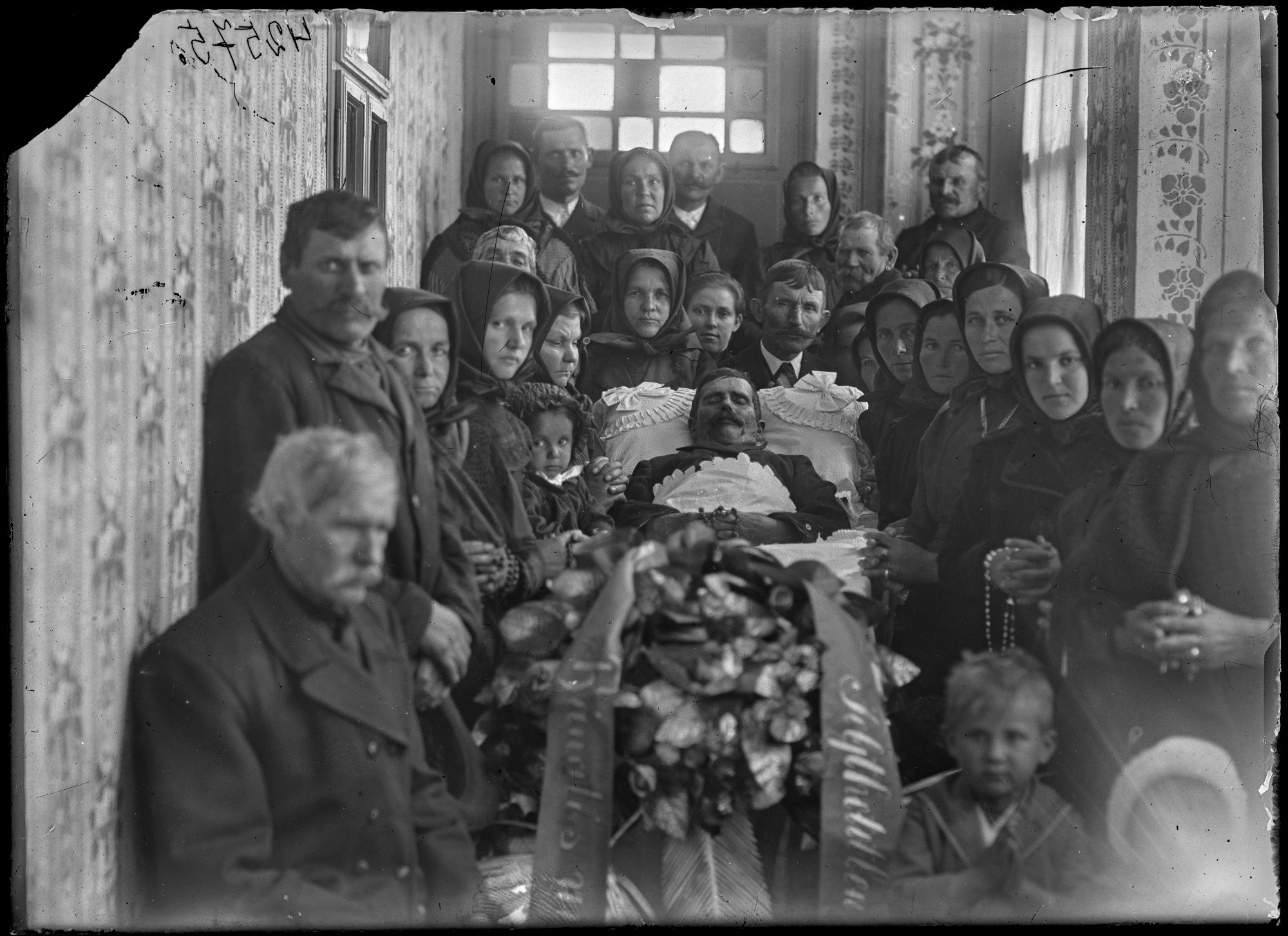 Zavarba jön az ember ennyi fekete kendős asszonytól, mintha mi késtünk volna el már megint a temetésről, ráadásul vagy száz évet. Elöl a koporsó mellett kisfiú szorítja imára a kezét, katonakorú ember talán csak egy van a gyászolók között. Háborúban nagy a nőtöbbség, a férfiak a fronton, egy meg a faládában, ő már nem kel fel, pedig szépen ki van fésülve a bajsza. A rokonok a fényképész utasításait lesik: ravatal van, elhívták a városi fotográfust, a halál még nem akkora tabu, a megboldogultnak is jár a csoportkép, ha már egyszer miatta vannak itt ennyien.