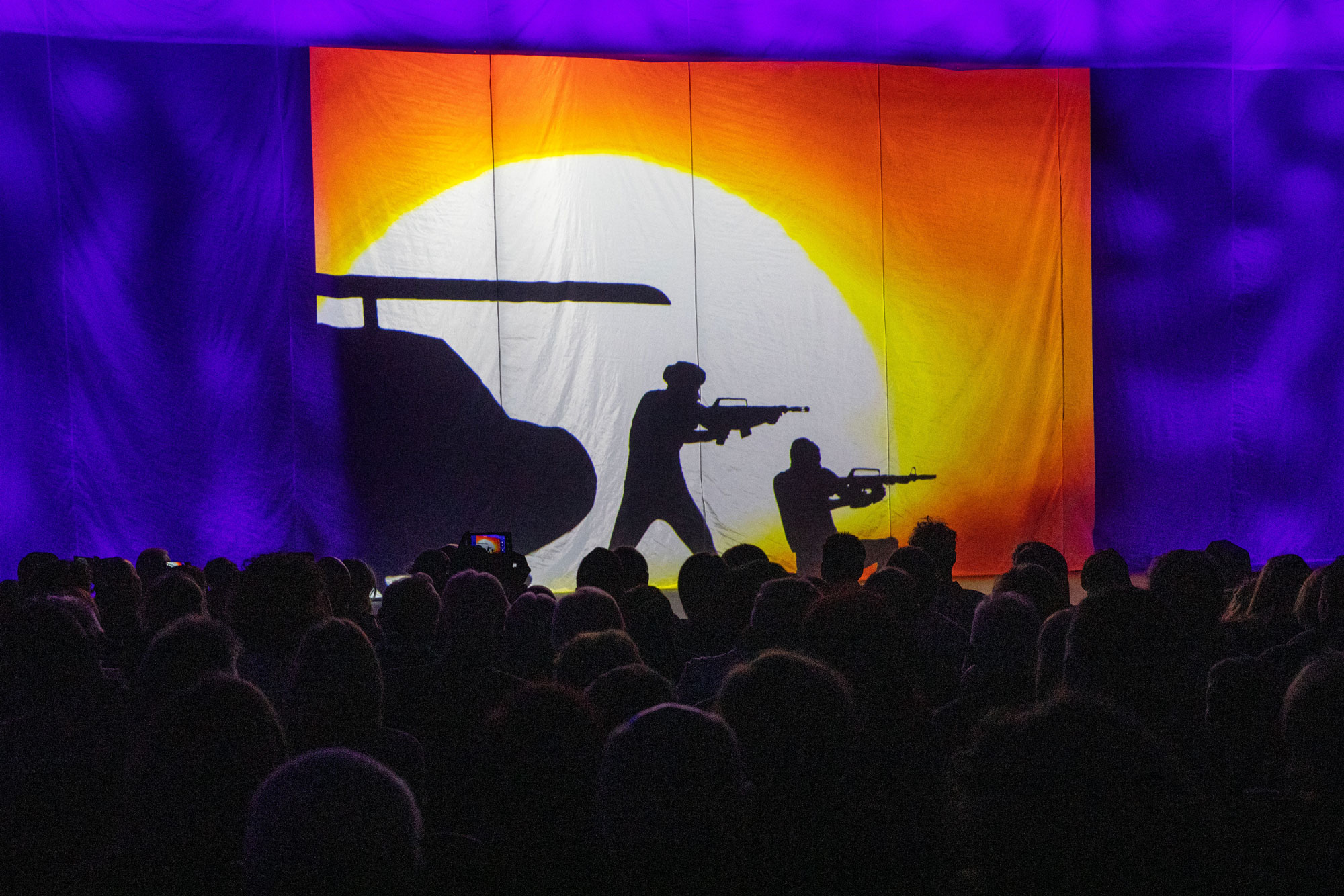 A szervezők mind Partos Bencének vannak öltözve, garbó, zakó, csatos öltönycipő a dresscode. Helyet foglalok a sajtókarámban, a műsor árnyjátékkal indul.