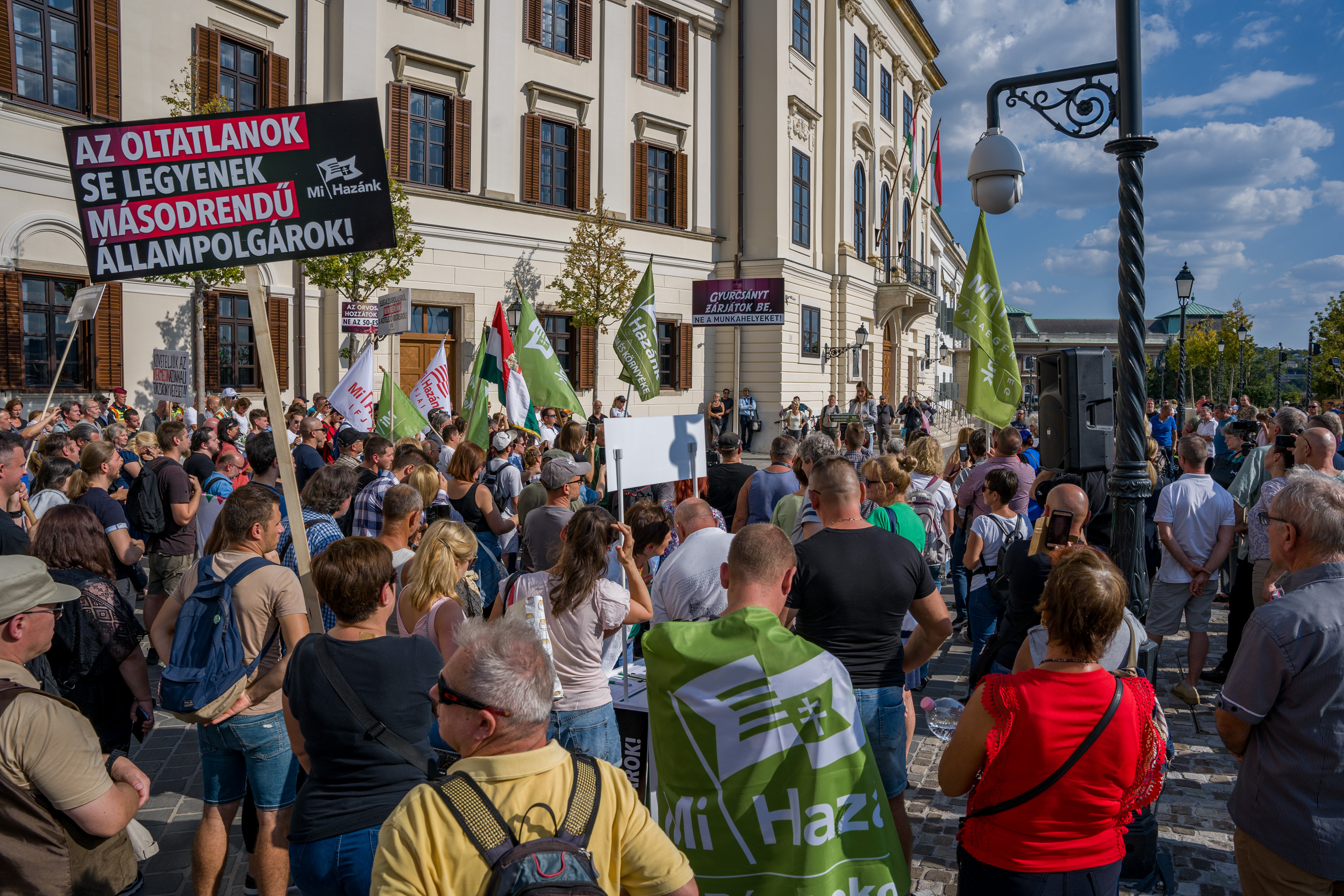 Palágyi Barbara / 24.hu Dúró Dóra, a Mi Hazánk Mozgalom országgyűlési képviselője beszédet tart a párt Covid-oltások kötelezővé tétele elleni tüntetésén a budai Várban, Orbán Viktor miniszterelnök hivatala előtt 2021. szeptember 4-én.