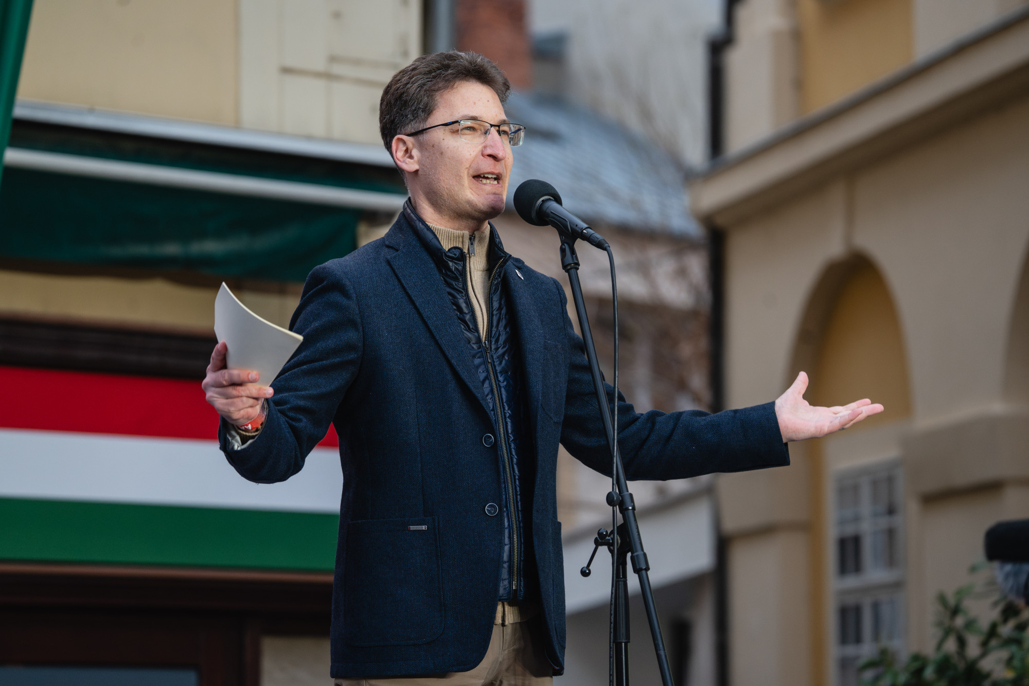 „A következő kérésem pedig azokhoz lenne, akik itt vannak velem szemben. Hiszen a kamerák önök mögött dolgoznak. Mikor felemelik a zászlókat, legyenek szívesek egy picit alacsonyabban tartani.