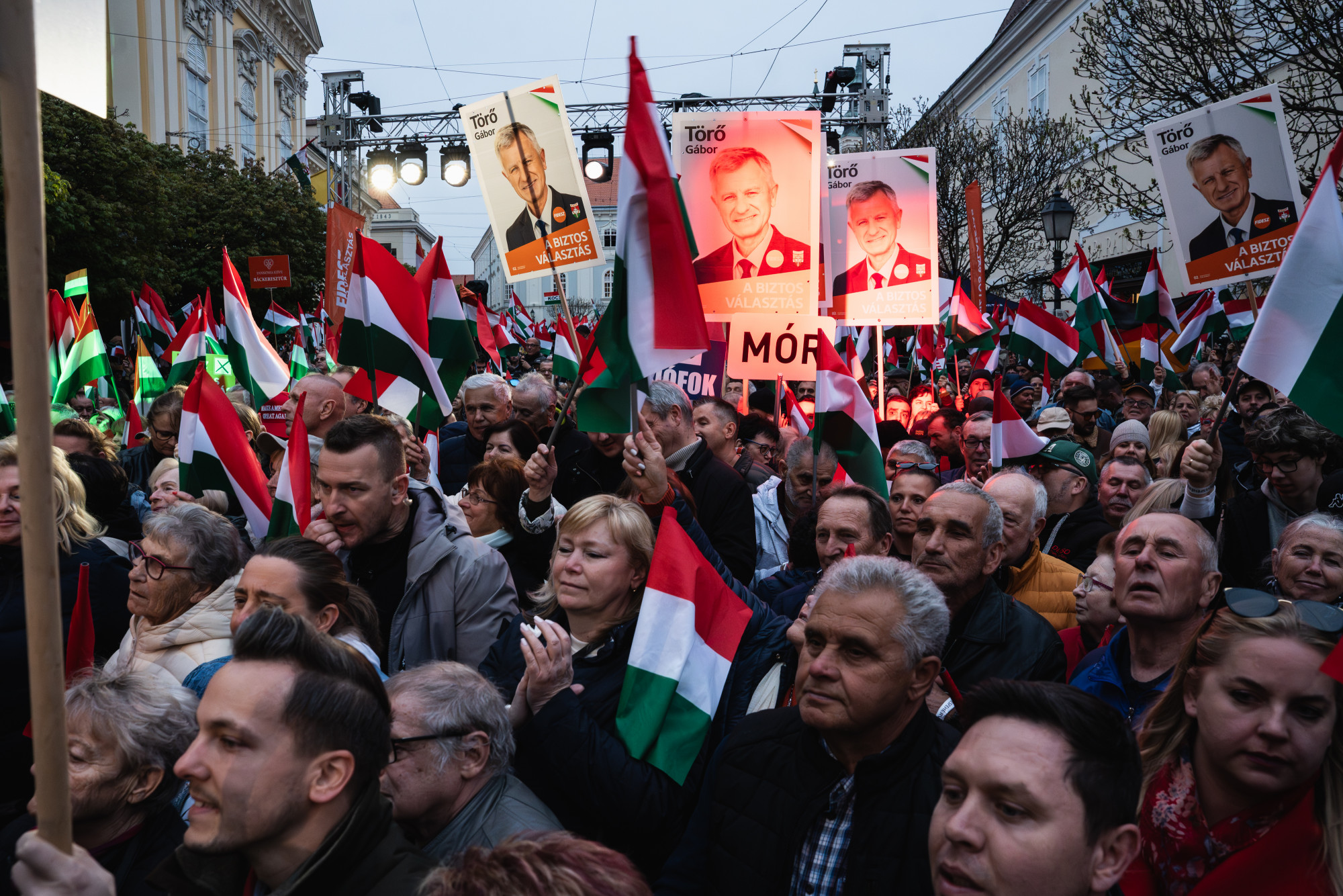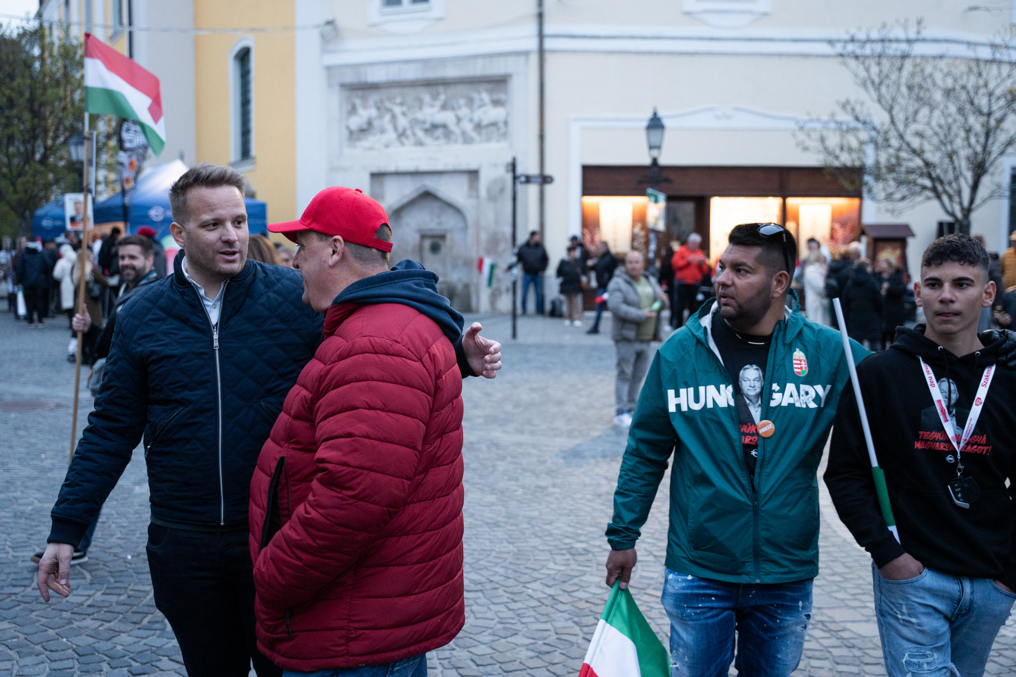 Tessely Zoltán képviselői bajsza alatt huncut mosoly, ahogy elhalad a székesfehérvári Városház téren gyülekező fideszesek mellett. A bicskei székhelyű Fejér 3-as választókerület jelöltjének nincs sok dolga, a felmérések szerint jól áll, férfias kézfogásokat fogad, joviálisan mosolyog. Az Orbán-beszédre háromezresre duzzadó tömegnek annál több a dolga: a színpadmester instruálja őket, először a táblákat próbálják el, aztán a zászlót.