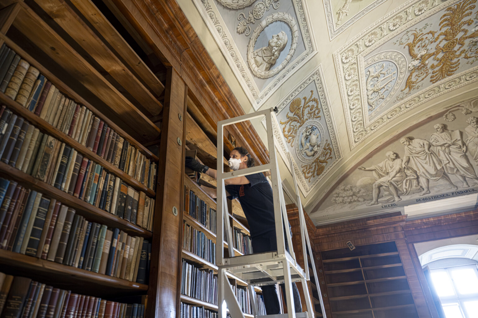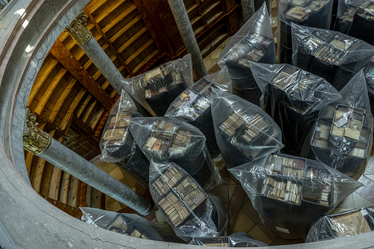 A munka egyik leglátványosabb, egyben legösszetettebb része a könyvállomány teljes lepakolása és rovarmentesítése volt. A nyár folyamán a mintegy 100 ezer kötetet háromezer ládába csomagolták, majd hatalmas fóliazsákokba zárták, és anoxiás – oxigénmentes – környezet kialakításával hat héten át kezelték. A visszafertőződés kizárására a polcokat teljesen fertőtlenítették, mielőtt a csomagokat felbontották. Másfél hónapig mind az 1800 polc üresen állt.