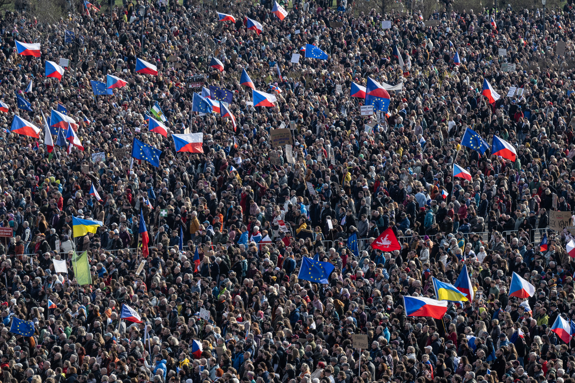 A tüntetők cseh, uniós, NATO- és ukrán zászlókat vittek magukkal, de szép számmal lehetett látni kormánykritikus transzparenseket és Petr Pavel államelnököt, a közszolgálati televíziót és az állami intézményeket támogató táblákat is. A Letna-park ikonikus prágai tüntetési helyszín, az 1989-es bársonyos forradalom idején is több százezer embert vonzott.