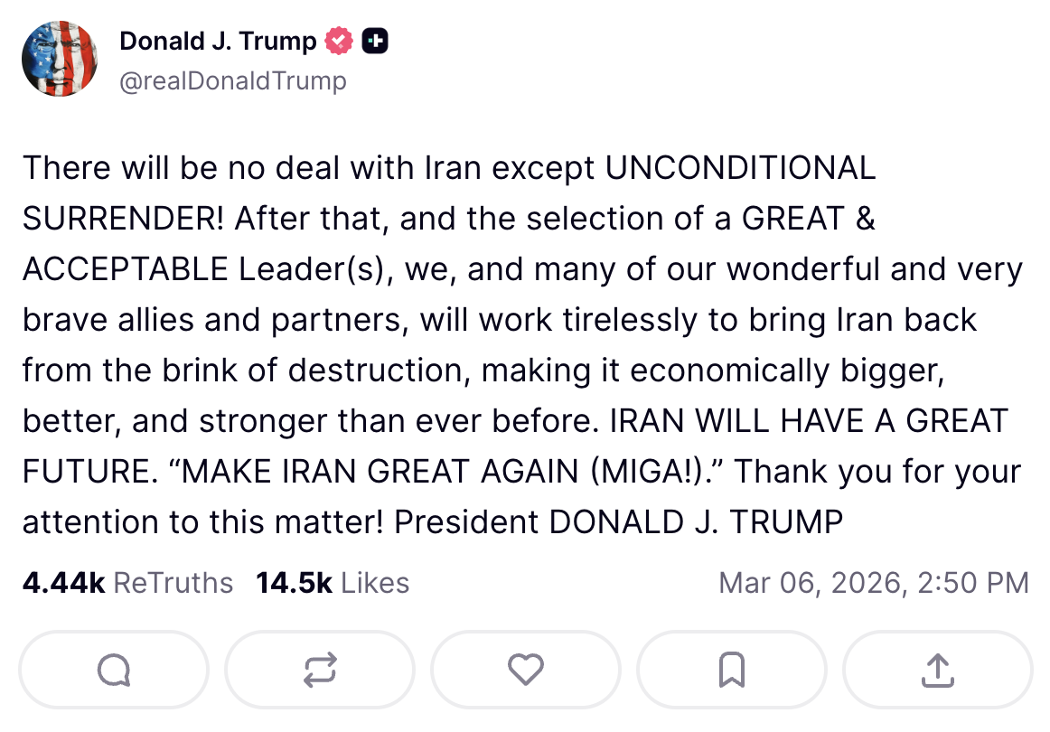 Trump a saját közösségi oldalán, a Truth Socialön azt írta: „Iránnal semmilyen megállapodás nem lesz, kivéve a FELTÉTEL NÉLKÜLI MEGADÁST!” A bejegyzés azután született, hogy Maszúd Pezeskian iráni elnök arról beszélt: több ország is közvetíteni próbál a felek között, bár nem nevezte meg, kikről van szó.
