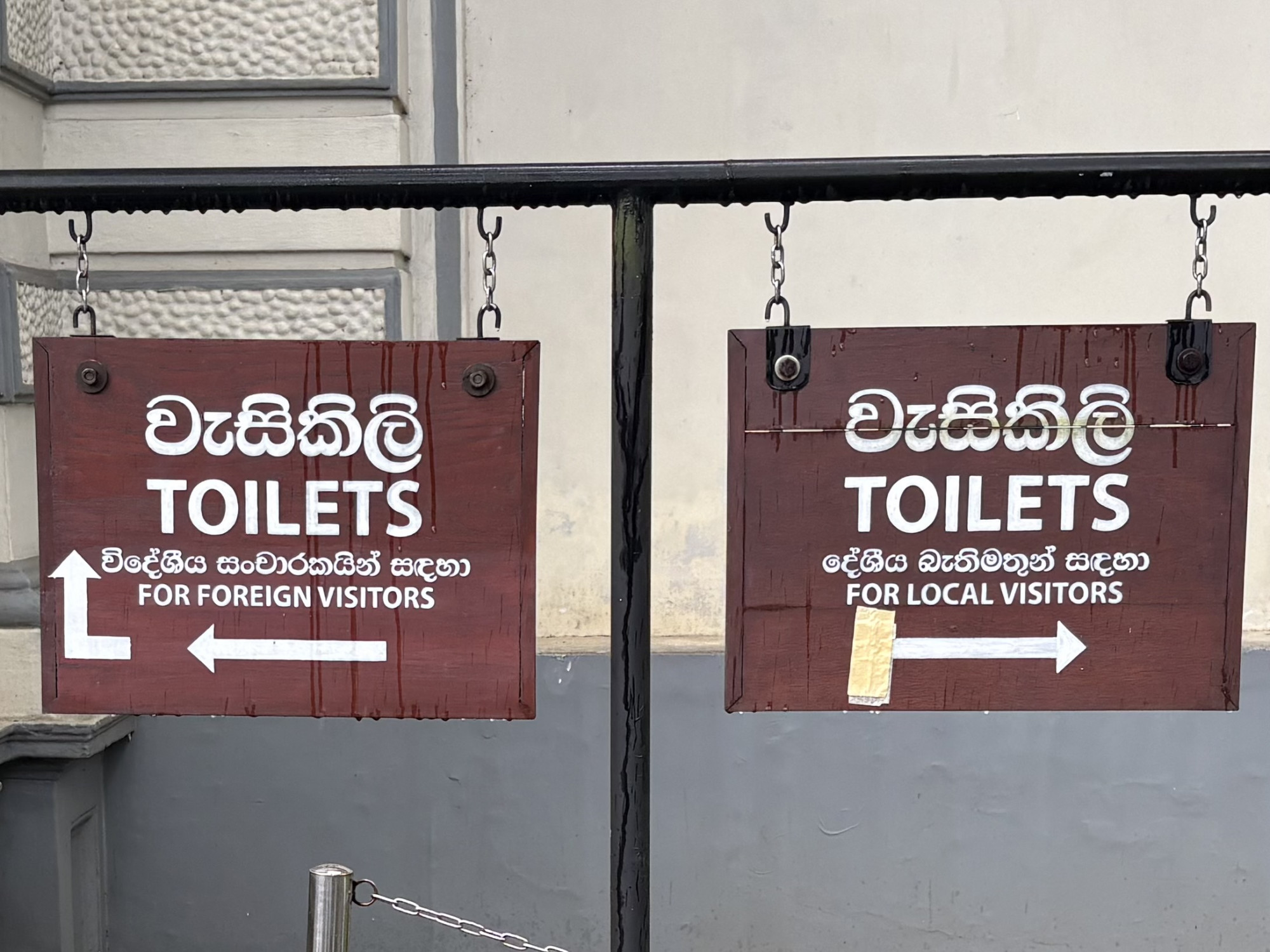 Ha viszont valaki a szentély falain kívül vécére szeretne menni, ott bizony választás elé kerül: a felirat szerint balra kell fordulniuk a külföldieknek, jobbra a helyieknek. A fehér európainak nem kell bizonyítania, melyik a számára kijelölt irány, a mosdóban aztán kézmosás közben egy szintén Európából, vélhetően észak-európai országból érkező nő is a zavarát és szégyenérzetét fejezi ki afelett, hogy a külföldieknek elkülönített, szupertiszta angol vécéket tartanak fenn. A helyieknek fenntartott vécé vélhetőleg pottyantós, ami egyébként a tapasztalatok szerint pont olyan tiszta máshol is, mint az angol vécé, de amikor egy vendéglátóhelyen ennek használatára kerülne a sor, akkor szabadkozva, előre figyelmeztetve szólnak a helyiek, hogy nekik csak „local toilette”-jük van.