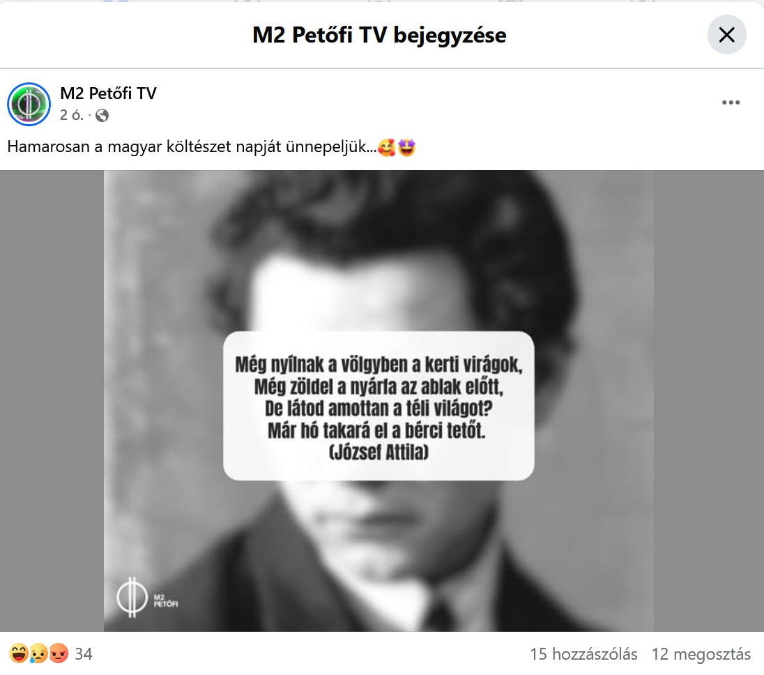 Igazi felüdülés minőségi magyar verset olvasni az idegeinket végső próbára tevő kampányidőszakban. Főleg, ha olyan megnyugtató témáról szól a vers, mint a virágok. Ezért is örültem annyira, hogy a köztévé kultúrcsatornája – az M2 Petőfi TV! – ezt az eddig ismeretlen, de instant klasszikusnak tűnő József Attila-strófát osztotta meg velünk a Facebookon: