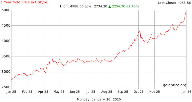 Folytatódik a tavaly 60 százalékot dráguló aranyár további dinamikus emelkedése, és mostanra átlépte az 5000 dollár az arany unciánkénti ára – ez nagyjából 28,3 grammnak felel meg, vagyis grammonként 176,67 dollárba kerül a befektetési arany. Noha a grafikonon ez már nem látszik,