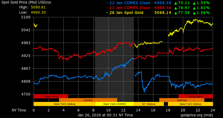 A Goldprice.org adatai szerint a hétfői kereskedésben már 5090 dollár fölött is volt az unciánkénti ár, ami csak az előző naphoz képest bő 1,5 százalékos drágulást jelent.
