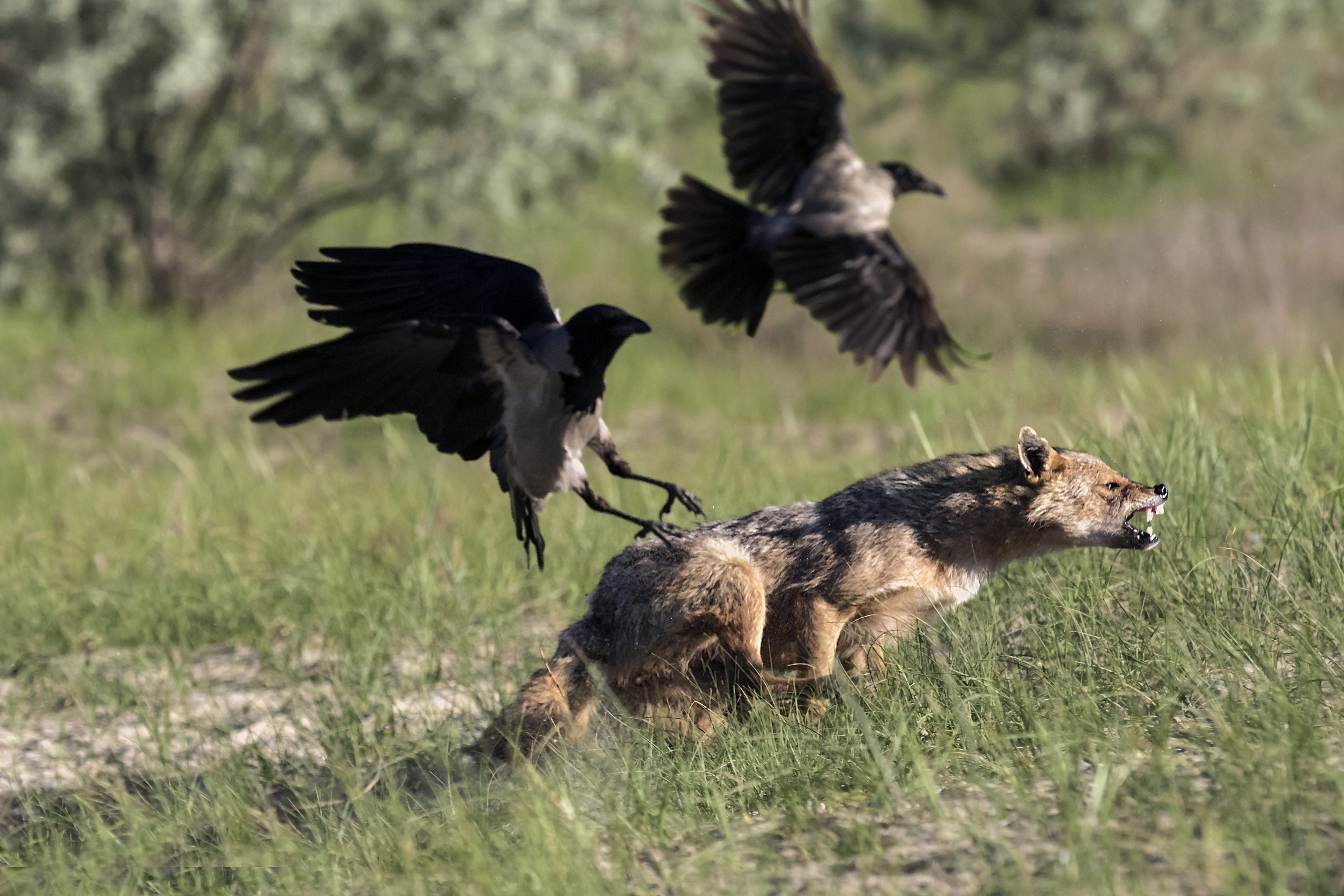 Azt is megírtuk, hogy a varjúfélék (Corvidae) a természetben is vehemensek. Orbán szerint a dolmányos varjak (Corvus cornix) még a rétisasokkal (Haliaeetus albicilla) is leállnak „böllénkédni” (magyarul kakaskodni, emberkedni, illetve madárkodni), ha pedig úgy kívánja a helyzet, a levegőben is megkergethetik a náluk jóval nagyobb sast. Fiókareptetés idején pedig a faj egyedeinek egyre megy, hogy ember, tigris vagy aranysakál közelíti-e meg a szárnyaikat próbálgató utódaikat: ahogy az alábbi fotón látható, védelmező gerjedelmükben bárminek és bárkinek nekimennek.