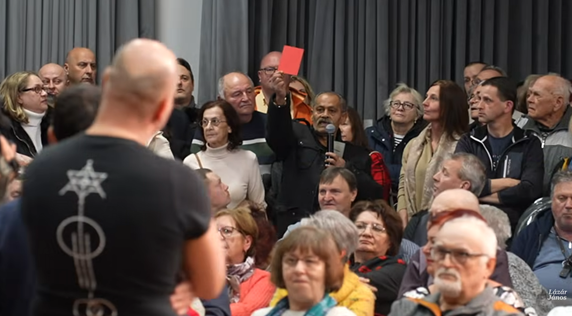 Aztán egy cigány férfi kérdezte fel a minisztert a korábbi cigányozása miatt. A férfi arról beszélt, hogy a Fidesz ledegradálta a cigányokat, ezért el fogja veszíteni a cigány szavazókat. Majd felmutatott egy piros lapot Lázárnak.