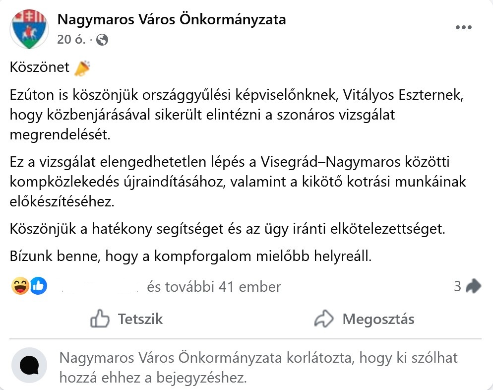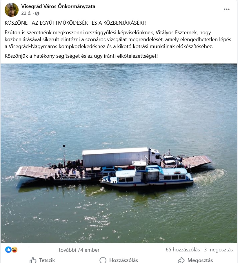 Szinte ugyanazzal a szöveggel köszönte meg Facebook-oldalán Visegrád és Nagymaros önkormányzata a térség országgyűlési képviselőjének, Vitályos Eszternek, hogy közbenjárt azért a szonáros vizsgálatért, amely ahhoz szükséges, hogy rendeződjön a komphelyzet a Duna két oldalán található két város között.